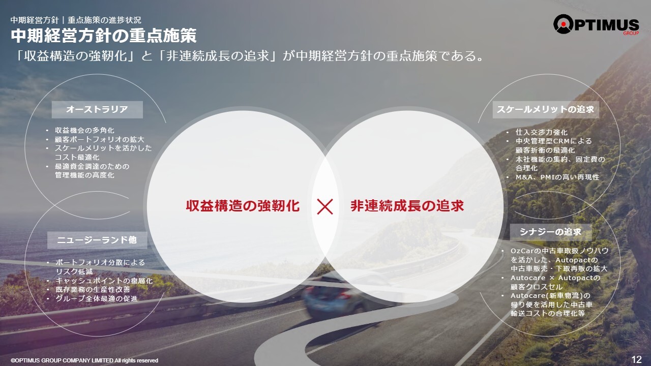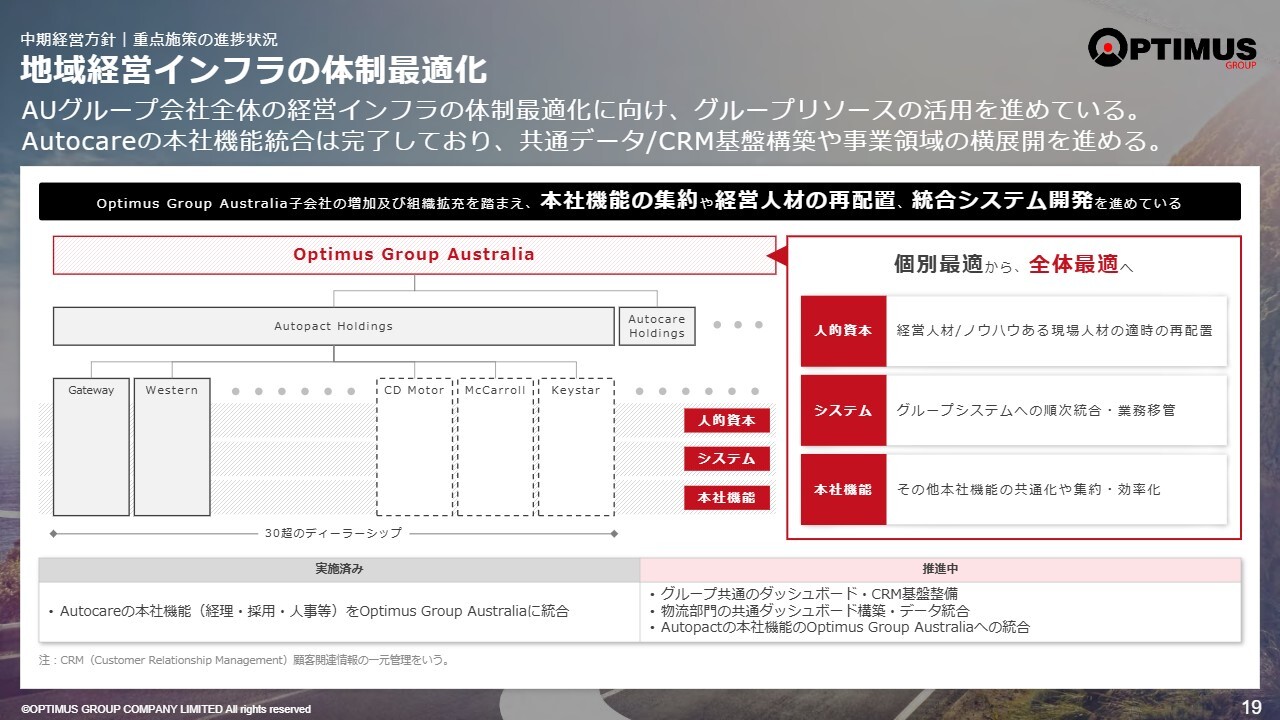 地域経営インフラの体制最適化について、ここはどんどん強化していこうと考えています。AutopactはM&Aを通じて会社を強化し、合理化・効率化を図っています。Autocareも個別の補強を行い、事業全体を強化していこうと思っています。このように、当社の重点施策である収益構造の強靭化をしっかりと進めています。