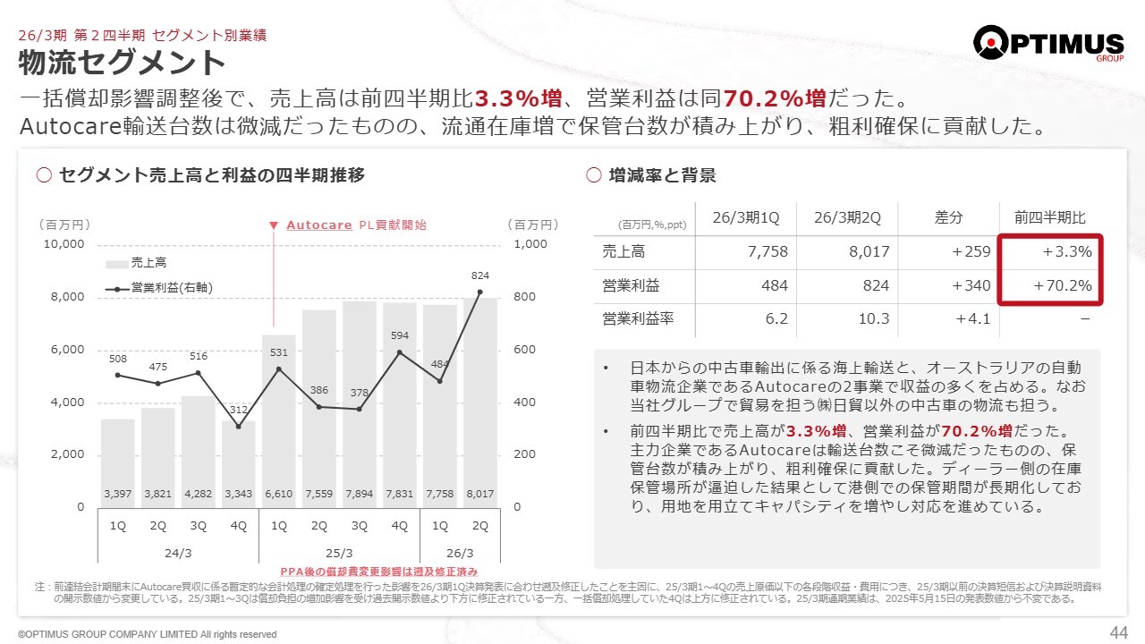 物流セグメントについてです。当社が得意とする、さまざまな事業を組み合わせて相乗効果や効率化を図っています。その中でオーストラリアにおけるM&Aで取得したAutocareが、結果としてオーストラリアで流通在庫が増えた影響を受けて、その増加した在庫をAutocareが預かり、その在庫が保管業務の増加につながり、Autocareの好業績に結び付いています。