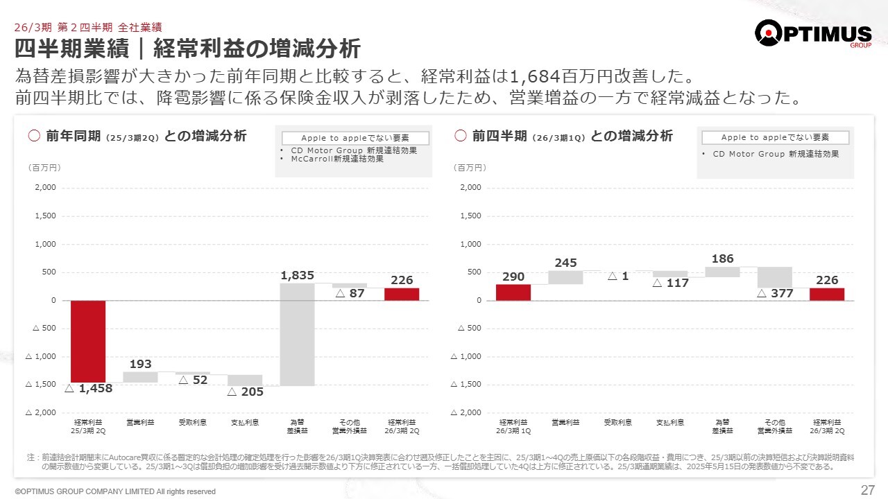 一方、利息関係では、オプティマスがAutopact向け融資の一部をデッド・エクイティ・スワップに変更したことにより、受取利息が約1億円減少しています。支払利息については、先ほどご説明したAutopactでの在庫増加に伴い、フロアプランの金利が4億円ほど増加しています。