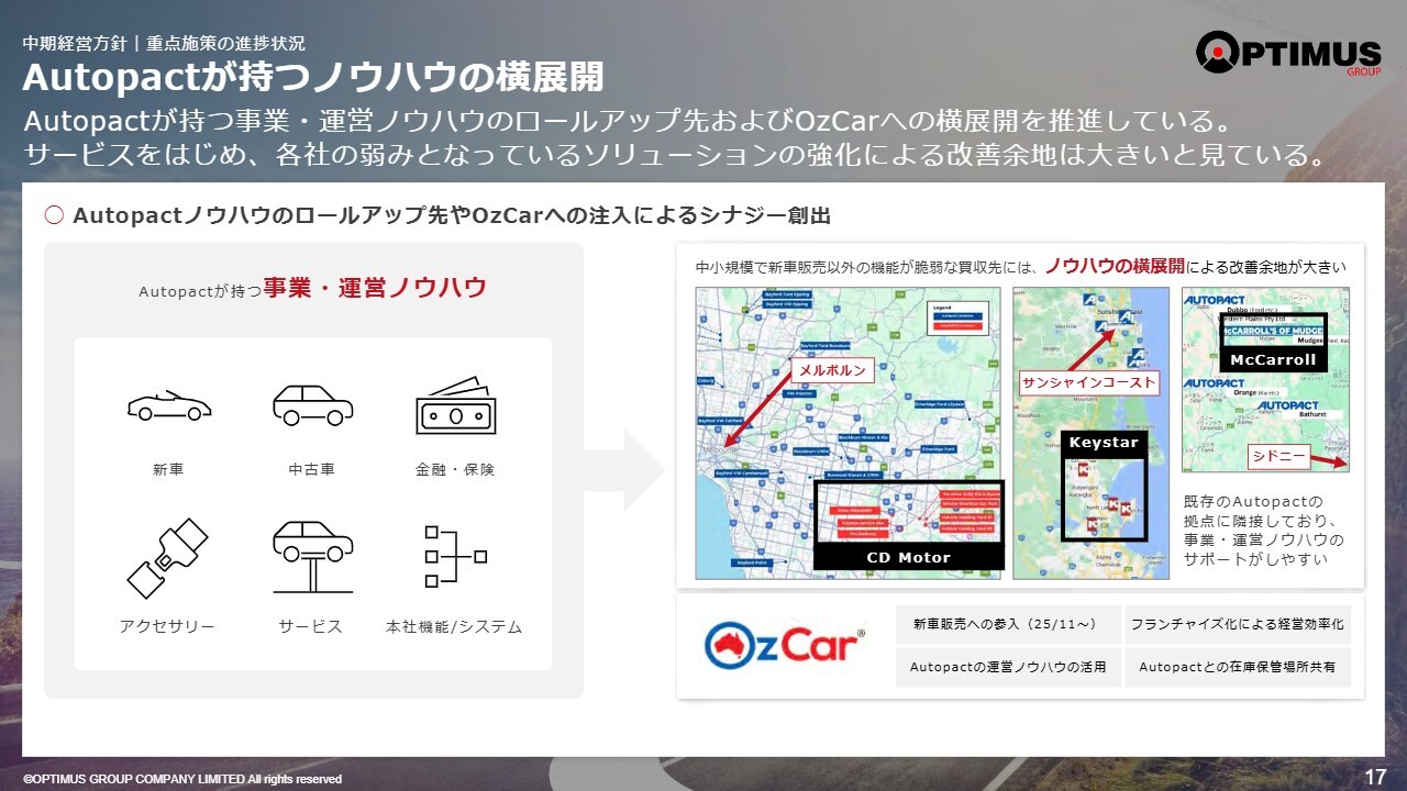 あとOzCarへの横展開について、これは双方向の展開を意味します。具体的には、新車事業のAutopactと、オーストラリアで展開している中古車事業のOzCarがそれぞれのノウハウを交換し合っています。