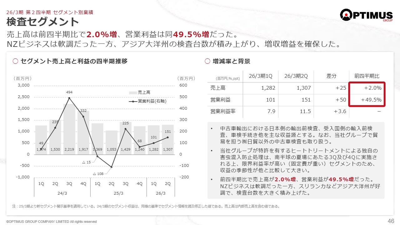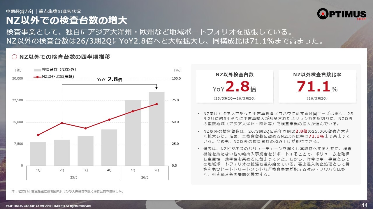 検査事業は昨年同期と比べ、ニュージーランド以外の市場での伸びが約3倍となっています。新しい市場での取りこぼしがないように努めていますが、既存事業が良い時期には忙しさに流され、他市場に取り組む機会を見逃しがちです。しかし現在の状況では、どこで生き残るかを模索しながら必死に仕事を進めた結果が、今回の数字につながっています。