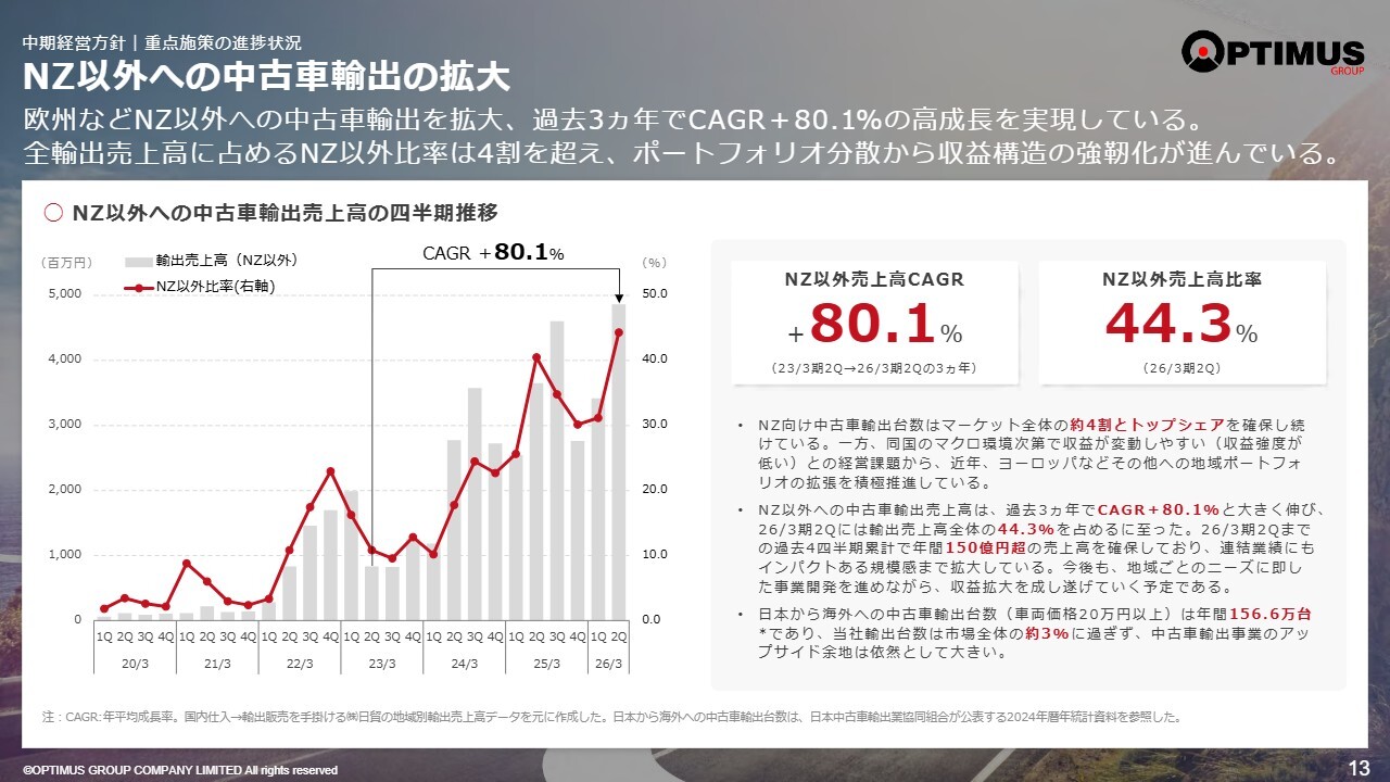 ニュージーランド以外のマーケット、すなわち日本からの中古車の輸出についてお話しします。直近の第2四半期では、ニュージーランド以外のマーケットへの中古車の輸出比率がおおよそ45パーセントに達しました。ニュージーランドの輸出台数が減少していることもありますが、それ以上にその他の海外市場を着実に伸ばしています。