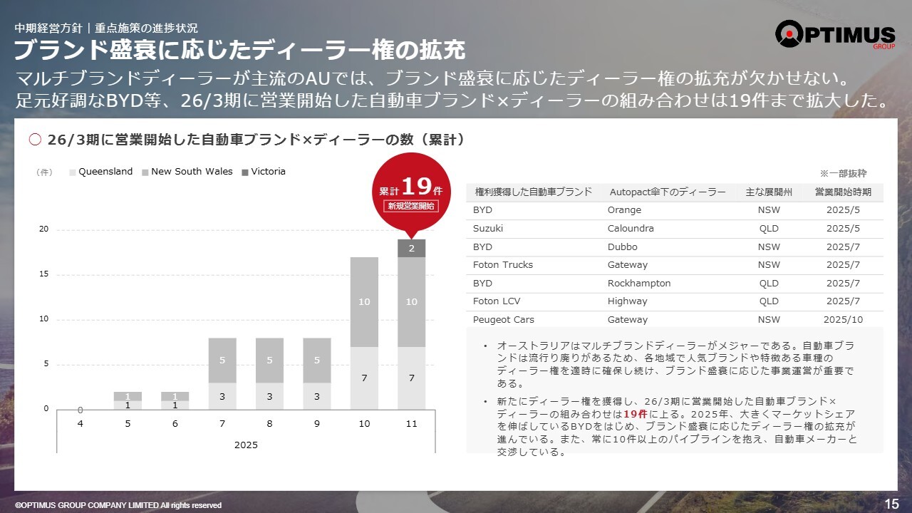 スライドには自動車ブランドとディーラーの数が19ショールームに増加したとありますが、現在も引き続き戦略を進めており、約30件に達するのではないかと考えています。