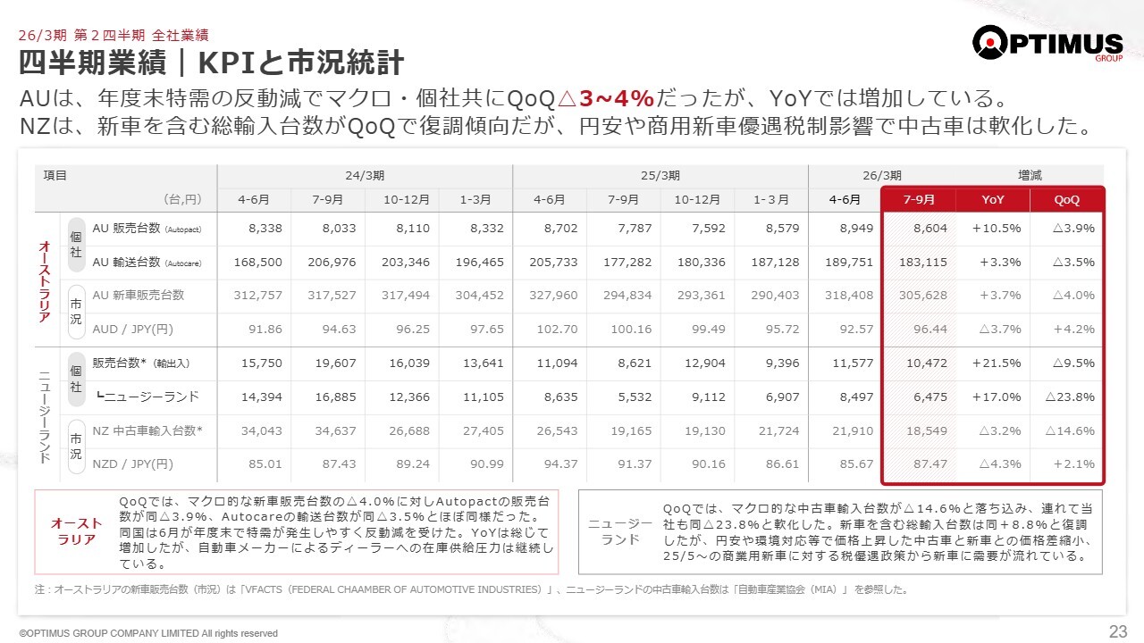 スライドには、KPIと市況統計を記載しています。この統計を確認すると、Autopactの販売台数は堅調に推移している一方で、ニュージーランド向け輸出台数に大きな変化が見られることがおわかりいただけると思います。