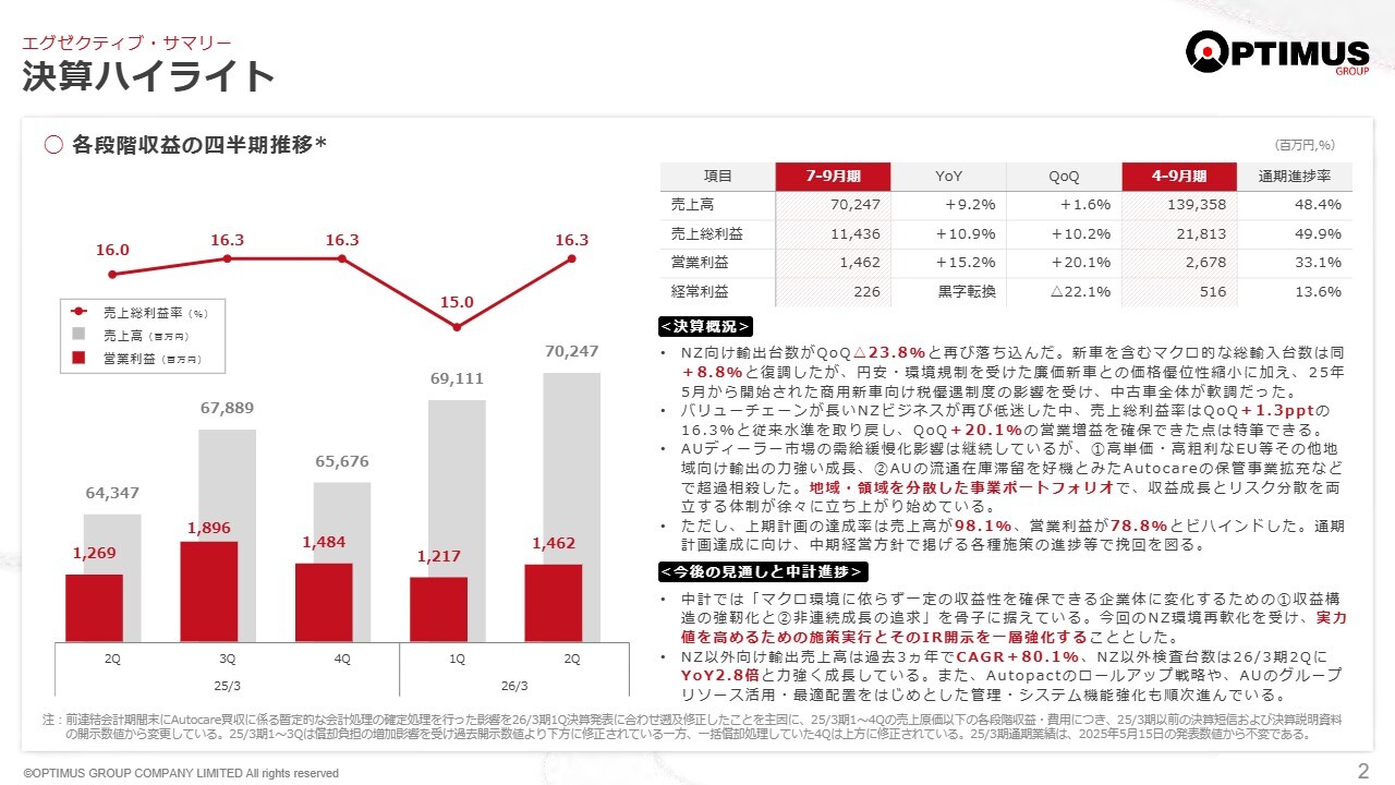 決算ハイライトについてご説明します。第2四半期の状況について、第1四半期から大きな変化は見られません。ニュージーランドでは引き続き景気の低迷が続いています。オーストラリアでは当社が新車事業を展開していますが、業界全体で在庫が過剰になっていることや競争の激化など、厳しい状況が続いています。こちらも第2四半期は第1四半期と同様の状況となりました。