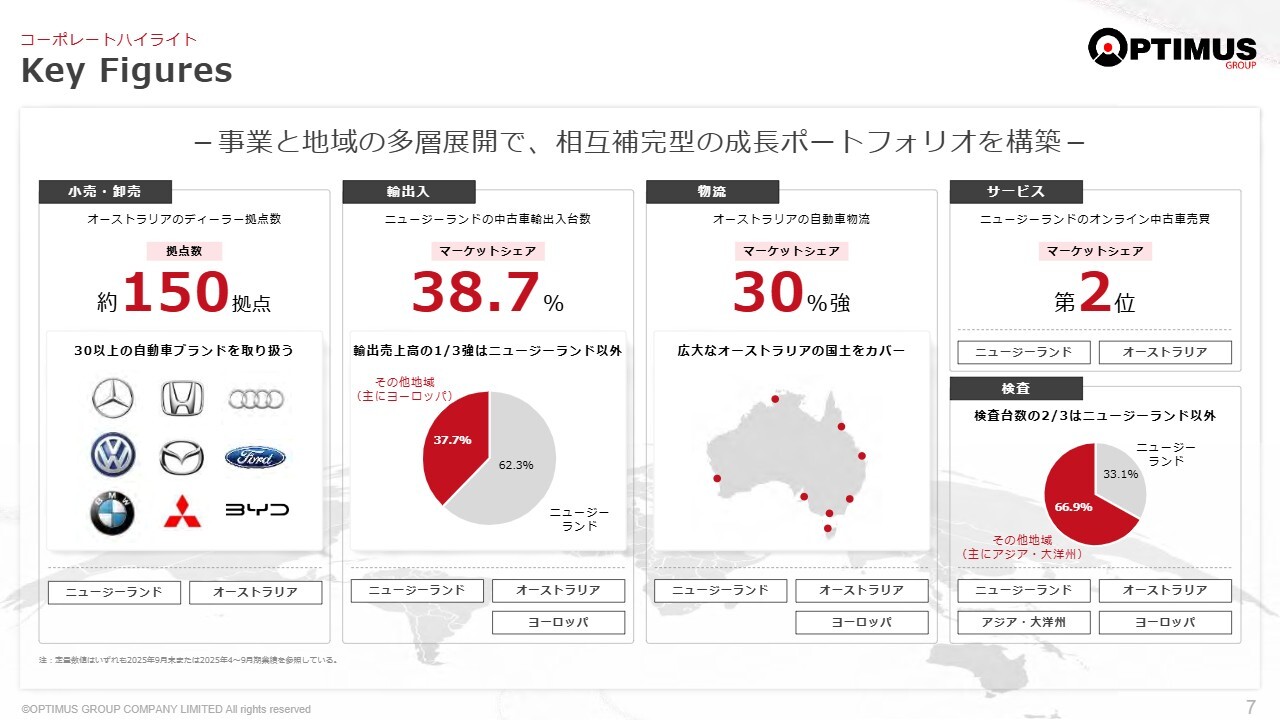 物流セグメントについてです。他社分も含め、日本からの輸出車両を中心に海上輸送の手配を行っており、日本、ニュージーランド、オーストラリアの3つの拠点で支えています。具体的には、日本の大和ロジスティクス、ニュージーランドのDolphin Shipping New Zealand、オーストラリアのDolphin Shipping Australiaの3社が連携し、海上輸送の手配を担っています。