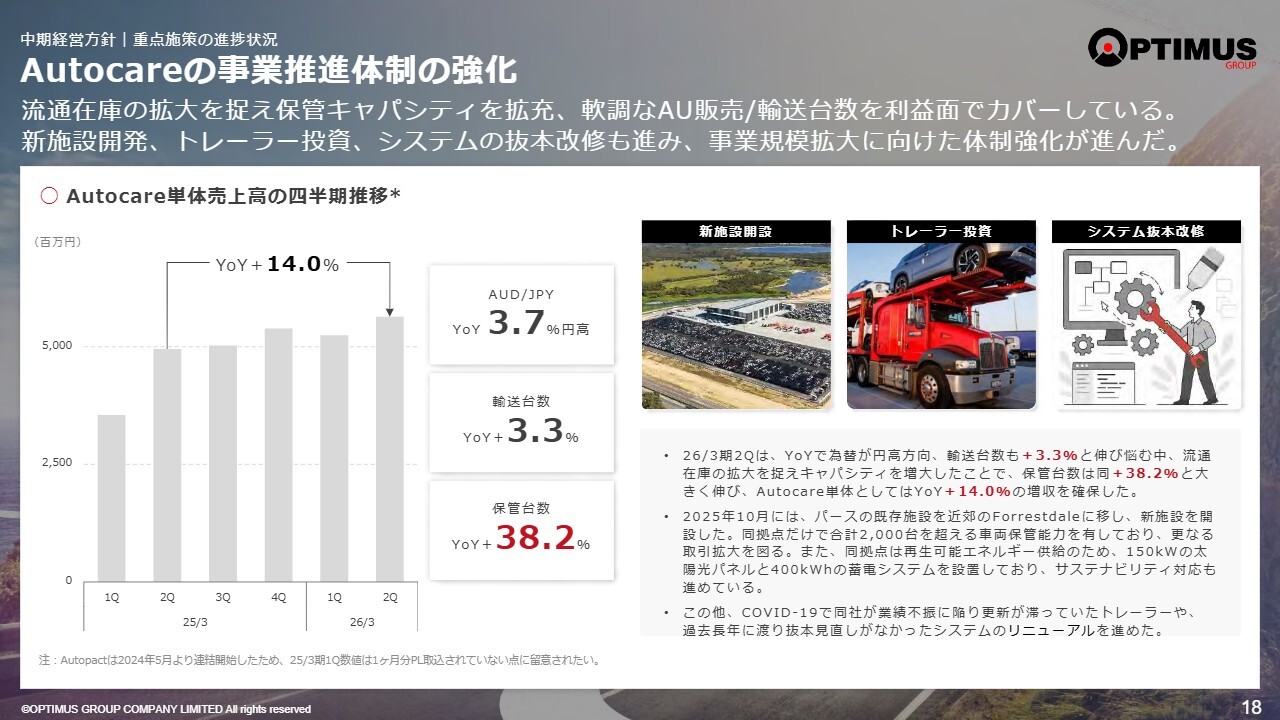 自動車輸送事業Autocareについてです。結果的に補完的な役割を果たし、前年同期比で保管台数が約40パーセント増加しています。
