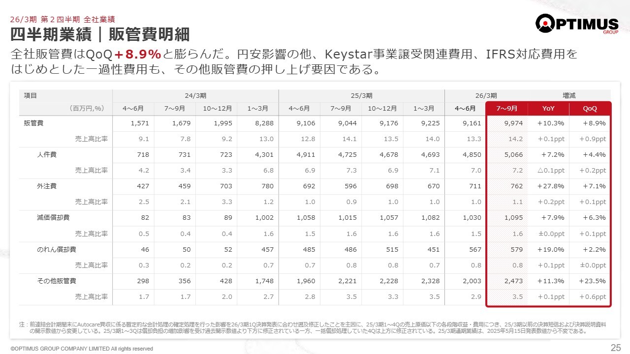外注費に関して、オプティマスにおいては、すでに公表のとおり、今期末から国際会計基準に切り替えることになります。これをはじめとして、いくつかの経営基盤整備関連の支出が増えており、5,000万円以上の支出となっています。