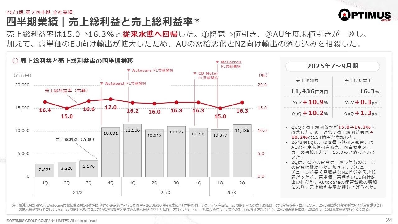 ニュージーランドを含むその他の地域では、2024年3月期の第4四半期以降も低調のまま推移しています。当社の連結業績では、自動車の価格そのものが売上高となる事業は、検査や海運業のように手数料を売上高とする事業と比較して、自ずと売上高に占める割合が大きくなります。従って、オーストラリアで新車のマルチディーラー事業を営むAutopactを買収して以降、その損益や資産が、連結業績に大きな影響を及ぼすようになりました。