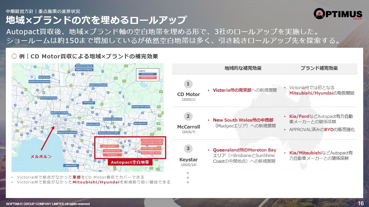 もう少し詳しく、地域のブランドの隙間を埋めるロールアップについてご説明します。一例に挙げているのは、ビクトリア州のメルボルン近郊です。これは、当社が行ったCD Motorsという会社の買収に関するものです。CD Motorsと、規模が小さいため開示していませんが、リリーデールという地域にあるHeritage Auto Groupというディーラーを買収しています。