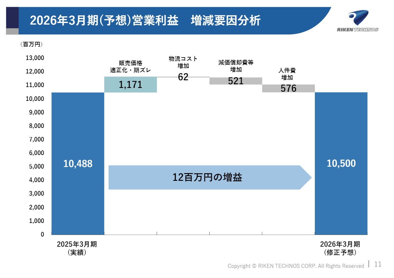 続きまして、通期の営業利益予想と前期との増減要因分析です。2025年3月期の営業利益は104億8,800万円です。増益の要因としては、販売価格の適正化および期ズレにより、11億7,100万円の増益が見込まれています。一方、減益の要因としては、物流コストの増加が6,200万円、減価償却費等の増加が5億2,100万円、人件費の増加が5億7,600万円となっています。これらを合計すると1,200万円の増益となり、2026年3月期通期の営業利益は105億円となります。