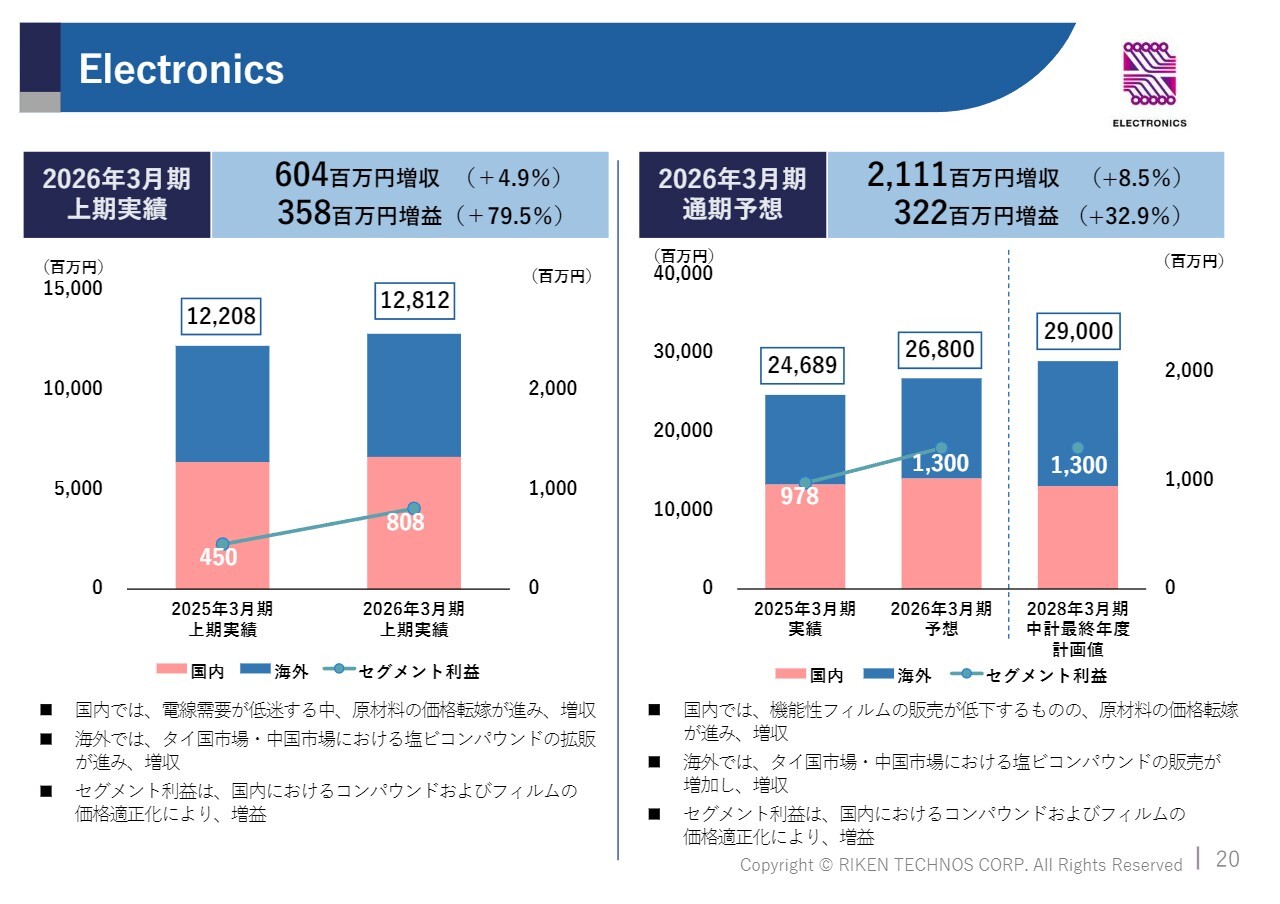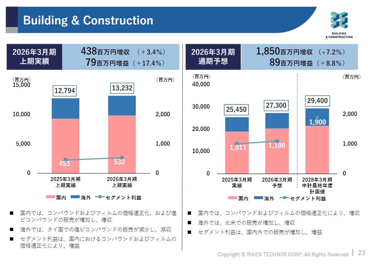 国内では電線需要が低迷しましたが、価格適正化が進み、増収となりました。海外では、タイ国市場および中国市場での塩ビコンパウンド拡販が進み、増収となっています。セグメント利益は8億800万円で、前期比3億5,800万円の増益となりました。日本国内ではコンパウンドおよびフィルムの価格適正化により、増益につながっています。2026年3月通期の予想は、売上高268億円で前期比21億1,100万円の増収を見込んでいます。