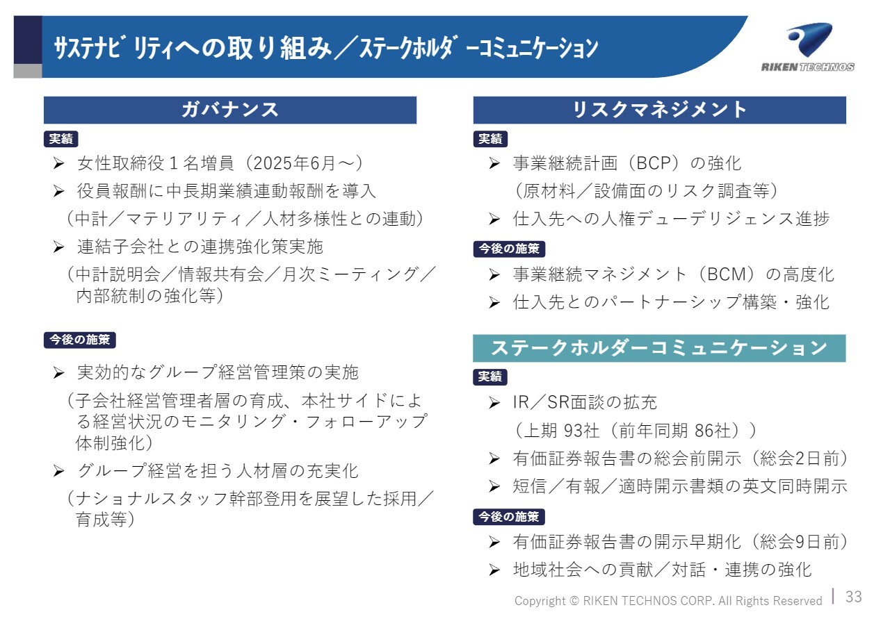 続きまして、ガバナンスについてです。女性取締役を増員し、役員報酬制度に中長期業績連動報酬を導入しました。また、連結子会社との連携強化策を実施しています。今後もグループ経営管理の実効性を高める施策を進めていきます。さらに、グループ経営を担う人材層の育成にも注力します。リスクマネジメントでは、BCPや人権デューディリジェンスの強化を進めました。