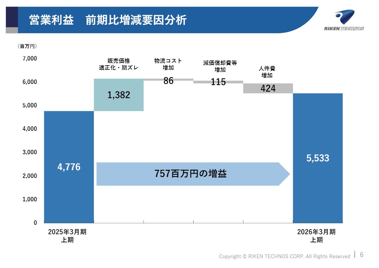 これに加え、価格改定の期ズレもあり、13億8,200万円の増益。一方、減益要因としては、物流コストの増加による8,600万円、積極的な投資に伴う減価償却費の増加による1億1,500万円、人件費の増加による4億2,400万円が挙げられます。これらを合計すると、7億5,700万円の増益となり、2026年3月上期の営業利益は55億3,300万円となりました。