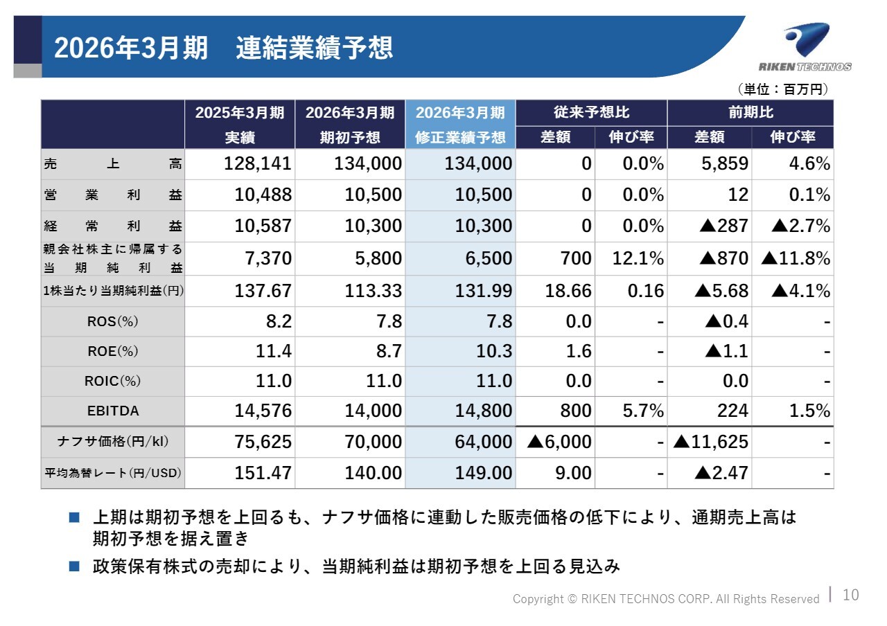 続きまして、2026年3月期通期の連結業績予想についてです。売上高を1,340億円、営業利益を105億円、経常利益を103億円、当期純利益を65億円と見込みました。本年4月30日に発表した期初の予想に対して、先行き不透明な現下の経済状況を鑑み、経常利益までは据え置いています。ただし当期純利益については、政策保有株式の売却見込みがあるため、7億円増益の65億円に上方修正しています。