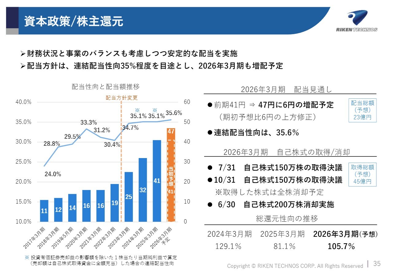 最後に資本政策および株主還元についてご説明します。当社の配当方針として、連結配当性向35パーセント程度を一つの目途とし、今後の事業投資や自己資本の充実等を考慮しながら、安定的な配当を行うことを基本方針としています。2026年3月期も引き続き増配を予定しており、前期比6円増の1株あたり47円を予定しています。