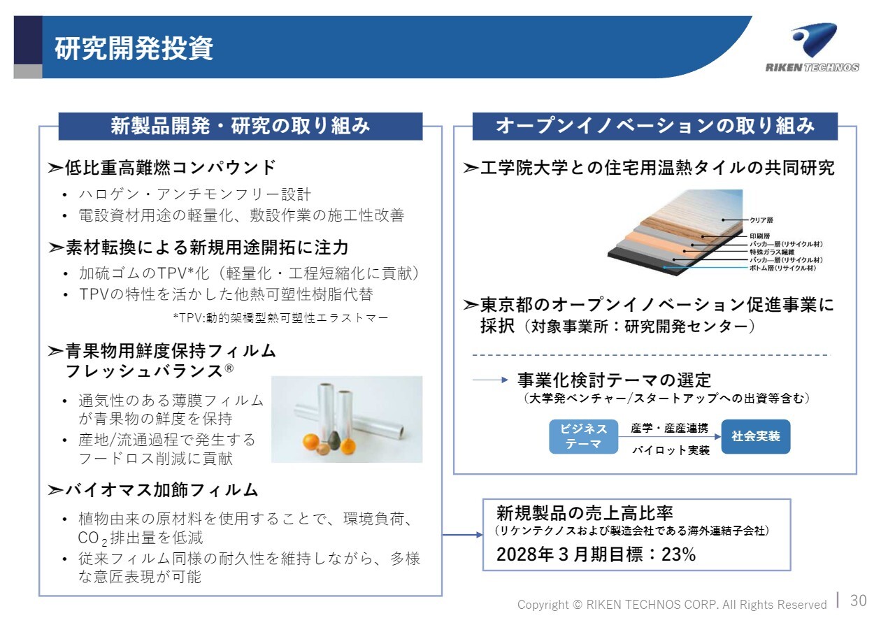 続きまして、研究開発投資についてご説明します。新製品の開発と研究の取り組みとして、まずコンパウンド分野では、低比重・高難燃コンパウンドの開発を進めています。エラストマーの特徴を活かした新規用途の開拓に注力し、ゴムからエラストマーへの素材転換を進めています。フィルム分野では、鮮度保持フィルム「フレッシュバランス」を発表しました。また、バイオマス加飾フィルムの開発も進展しています。