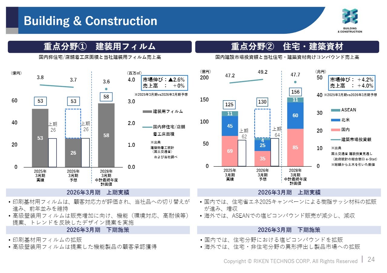 続きまして、ビルディング&コンストラクションセグメントの重点分野の状況です。まず1つ目は、建装用フィルムの分野です。市場状況として、日本国内の非住宅および店舗の着工床面積は前期比で2.6パーセント減少する見込みです。