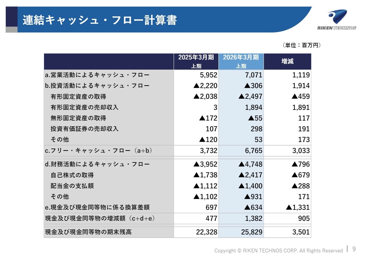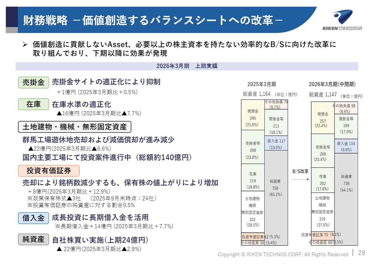 2026年上期の実績についてご説明します。売掛金サイトや在庫水準の適正化を進めるとともに、遊休土地の売却を実施しました。また、国内工場では投資案件を進行させています。投資有価証券については、保有意義を検証した上で圧縮しました。価値創造に貢献しないアセットを削減し、必要なキャッシュを創出して、成長投資や株主還元を実施していきます。