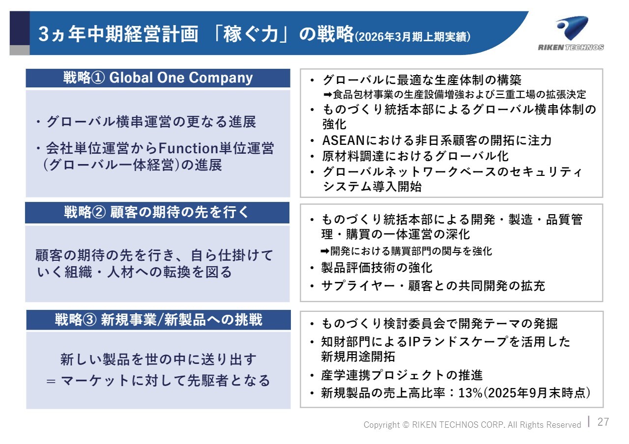 2025年9月までの上期の段階で、新規製品の売上高比率は13パーセントです。あまり外に出していないのですが、2025年3月末時点では10パーセントでした。3パーセント上がっています。ですので、6パーセント上げて「3×6=18」で進めていく予定ですが、この部分をどうやって上げていくかが、メーカーである私どもの最大のポイントだと思います。