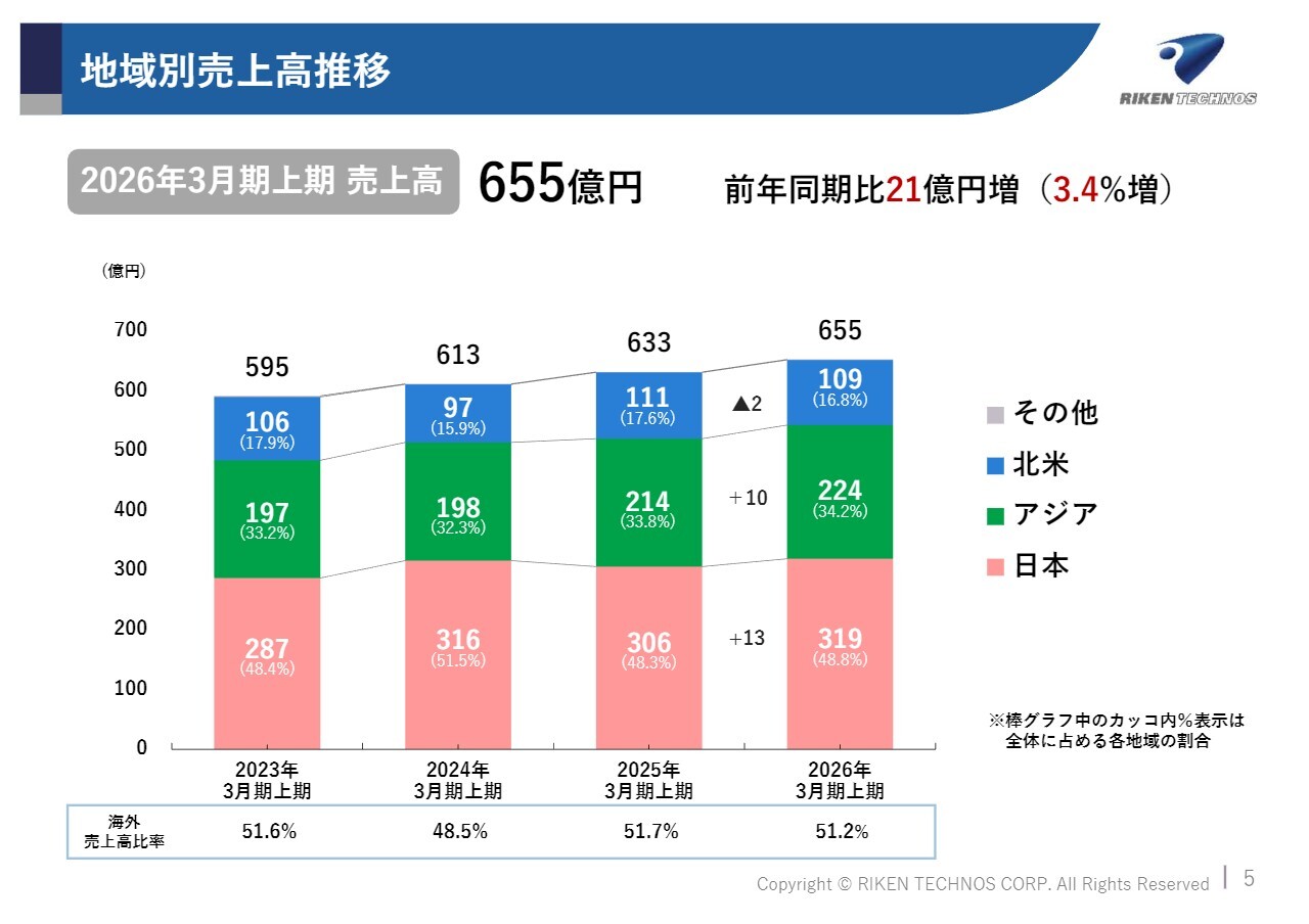 地域別の構成比は、日本が48.8パーセント、アジアが34.2パーセント、北米が16.8パーセント、その他の国が0.2パーセントです。また、海外売上比率は51.2パーセントとなり、前年同期比で0.5ポイント減少しました。