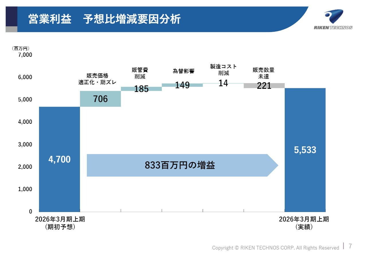 続きまして、営業利益上期の期初予想との増減要因分析についてご説明します。期初予想では47億円の営業利益を見込んでいました。増益の要因としては、販売価格の適正化および期ズレにより7億600万円、販管費の削減により1億8,500万円、さらに為替が円安に振れた影響で1億4,900万円、製造コストの削減分として1,400万円が挙げられます。