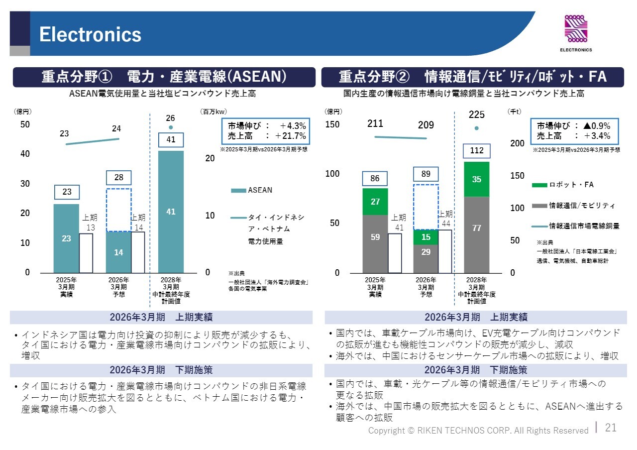 続きまして、当セグメントの重点分野についてご説明します。まず1つ目は、ASEAN地域における電力・産業用電線分野です。市場の状況についてですが、ASEAN地域の電気使用量は経済成長に伴い、今後も順調に拡大すると見込んでいます。同市場における当社のコンパウンドの売上高については、2026年3月期の予想で28億円を見込んでおり、前期比で5億円の増収を達成する計画です。