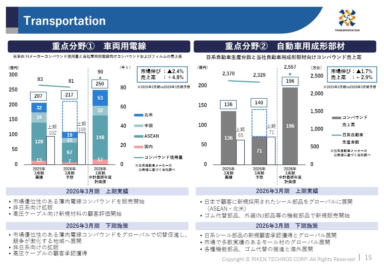 当分野における当社のコンパウンドおよびフィルムの売上高は、217億円を予想しており、前期比で10億円の増収を見込んでいます。また、自動車OEMの軽量化ニーズに応えることで市場優位性のある薄肉電線用コンパウンドを、グローバル規模で拡販していきます。