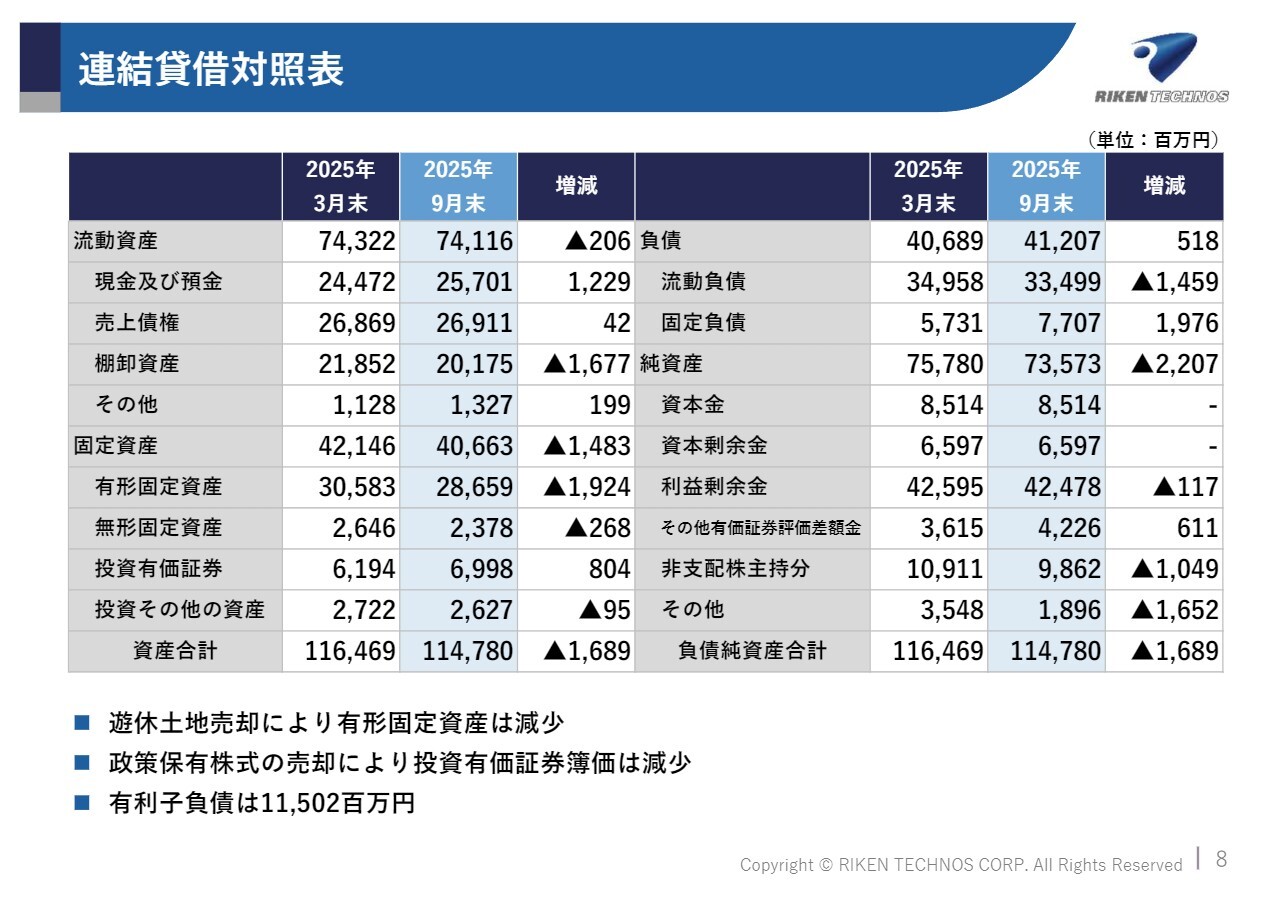 当社が成長できる分野には、国内外を問わずまだまだ投資の余地があるという点で、積極的に取り組んでいきたいと考えています。野一色も申し上げたように、9月末時点の6ヶ月間でバランスシートがどう変化したのかというと、在庫が少し減少した一方で、増加した項目もあります。ただし大きな流れとしては、不要不急の資産を売却してキャッシュ化し、さらに売掛金の回収サイトを短縮してキャッシュを創出し、それを成長投資に充てていく方針です。