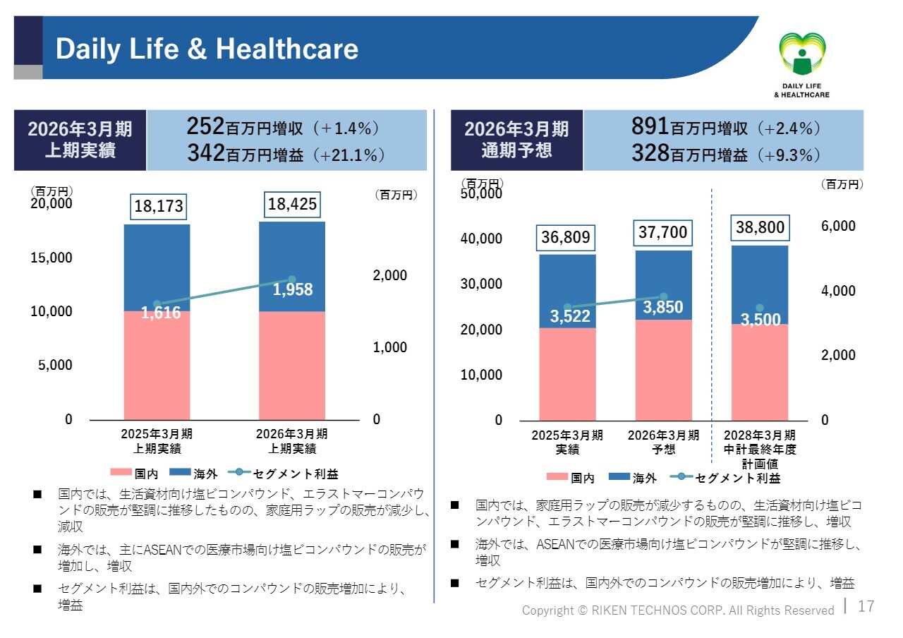 2つ目のセグメントであるデイリーライフ&ヘルスケアセグメントの状況についてご説明します。同セグメントの2026年3月期上期の売上高は184億2,500万円で、前年同期比2億5,200万円、率で1.4パーセントの増収となりました。国内では生活資材向けコンパウンドの販売が堅調に推移したものの、家庭用ラップの販売が減少し、全体では減収となりました。一方、海外では医療用塩ビコンパウンドの販売が増加し、増収となっています。