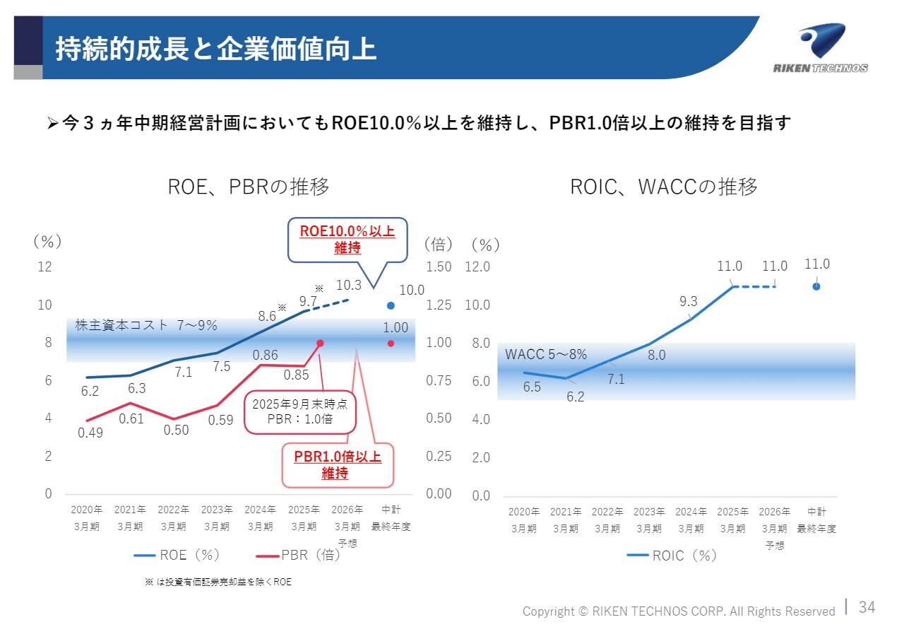 以上の戦略を確実に実行することで、現在の3カ年中期経営計画においてもROEを10パーセント以上に維持します。PBRについては、本年9月末時点で1.0倍以上を達成しています。