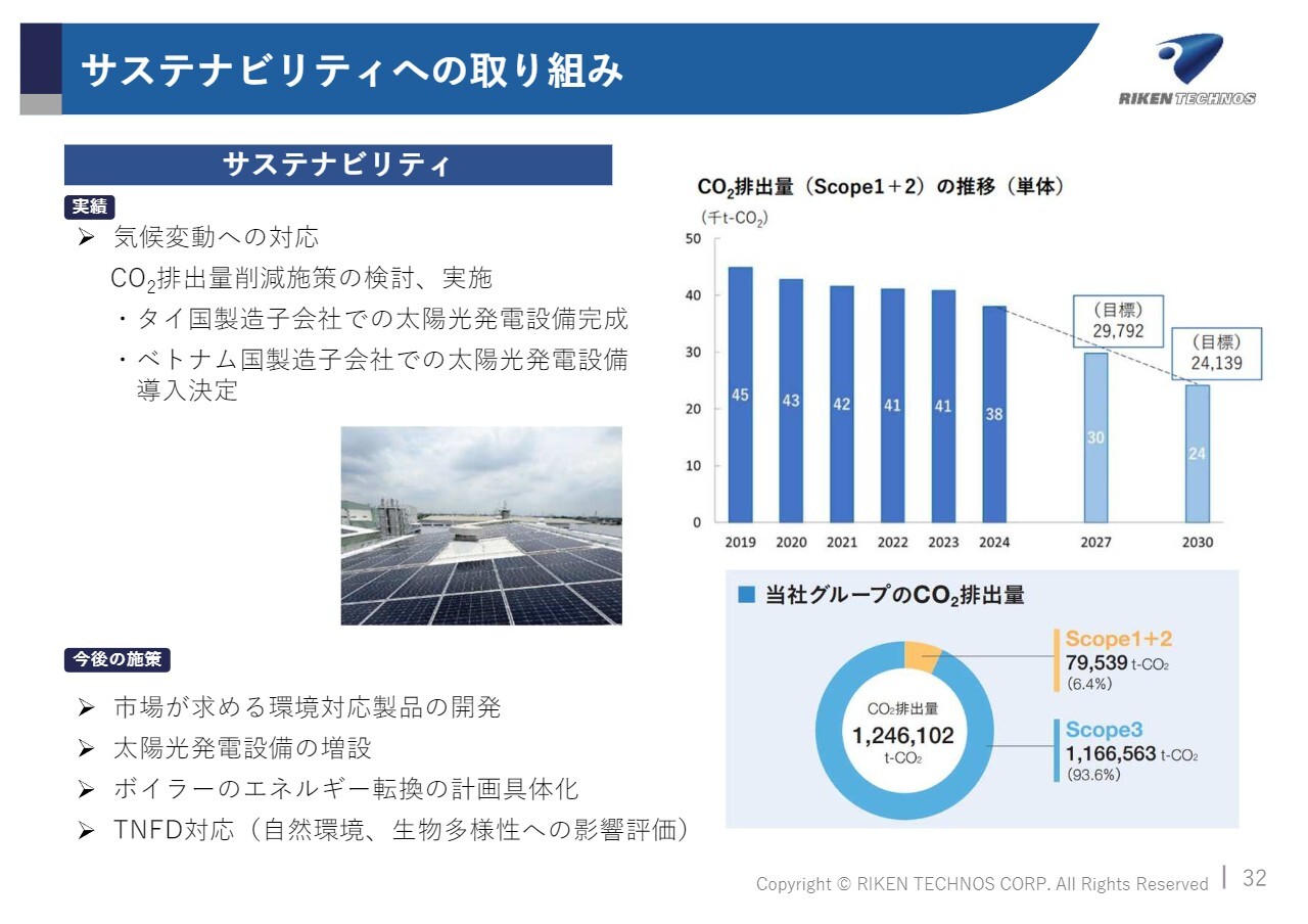 続きまして、サステナビリティへの取り組みについてご説明します。気候変動への対応として、2030年度にCO2排出量を46.2パーセント削減すること、そして2050年度にグループ全体でカーボンニュートラルを実現することを目標に掲げ、さまざまな施策を検討し実行しています。今年は、タイ国およびベトナム国にある製造子会社で太陽光発電の導入を進めています。今後も引き続き、CO2排出量削減に取り組んでいきます。