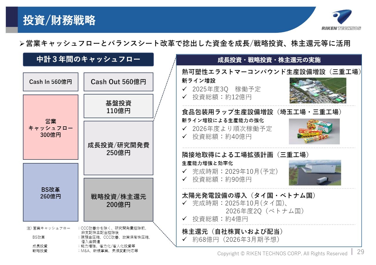 続きまして、投資/財務戦略についてご説明します。現中期経営計画の3年間で稼ぎ出す営業キャッシュ・フローに加え、バランスシート改革によって創出した資金を基盤投資、成長投資、研究開発投資、戦略投資、株主還元に活用していきます。成長投資として、埼玉・三重包装用ラップの増設設備に約40億円、三重工場の工場拡張計画に約90億円を、今後投資実行していきます。
