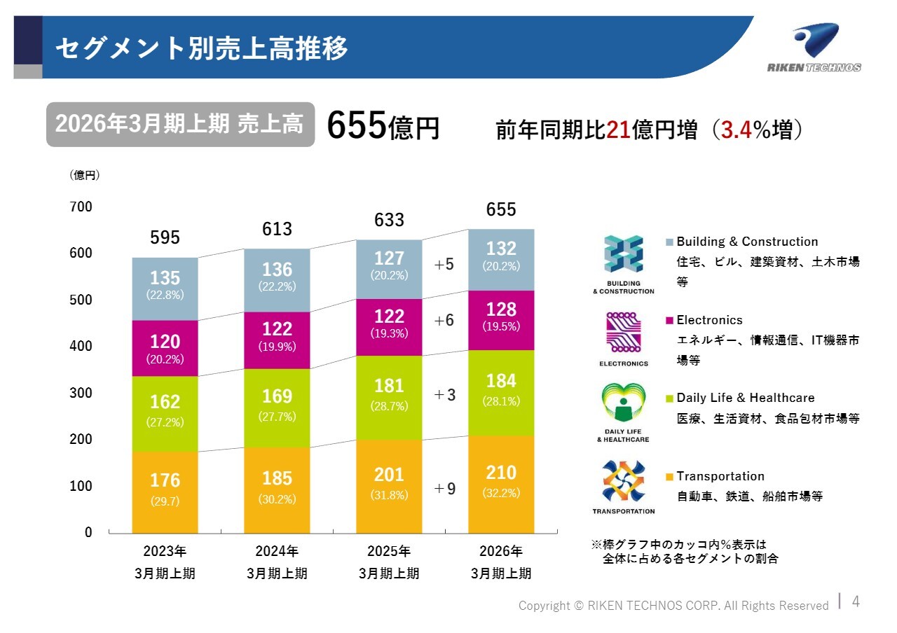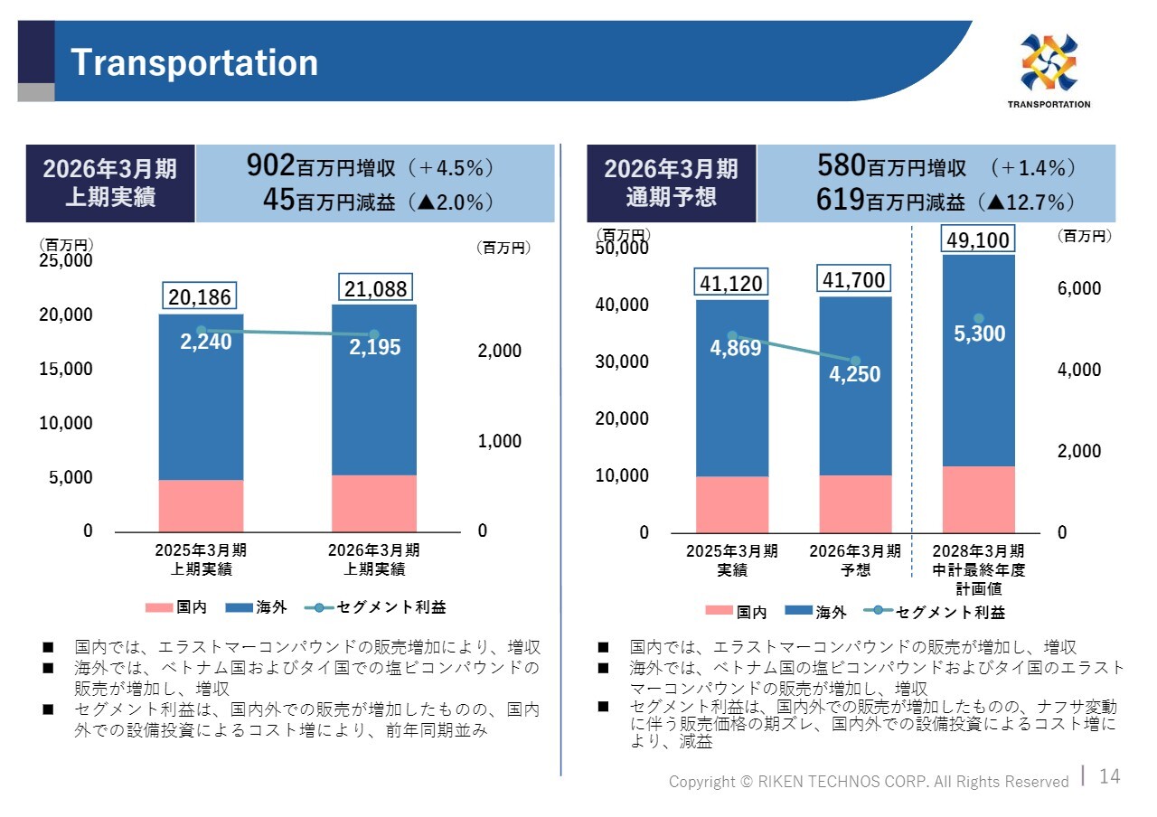 続きまして、セグメント別の概況についてご説明します。まず1つ目のセグメント、自動車等を含むトランスポーテーションセグメントの状況をご紹介します。トランスポーテーションセグメントの2026年3月期上期の売上高は210億8,800万円で、前年同期比9億200万円、率にして4.5パーセントの増収となりました。国内ではエラストマーコンパウンドの販売が堅調に推移し、増収となりました。