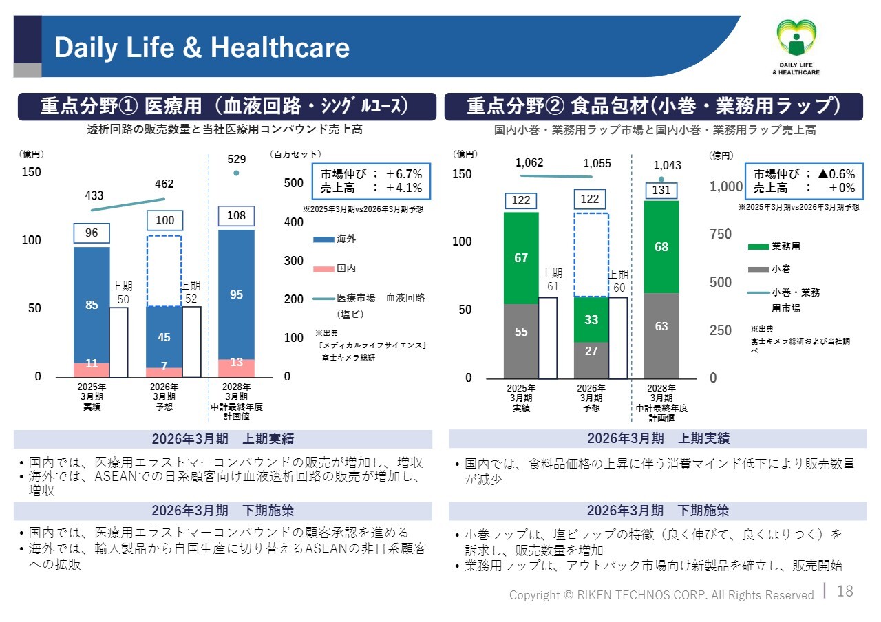 続きまして、デイリーライフ&ヘルスケアセグメントの重点分野についてです。まず1つ目は医療用材料です。当社が医療用分野で主にターゲットとしている透析回路の状況ですが、2026年3月期も順調に6.7パーセント増加すると見込んでいます。