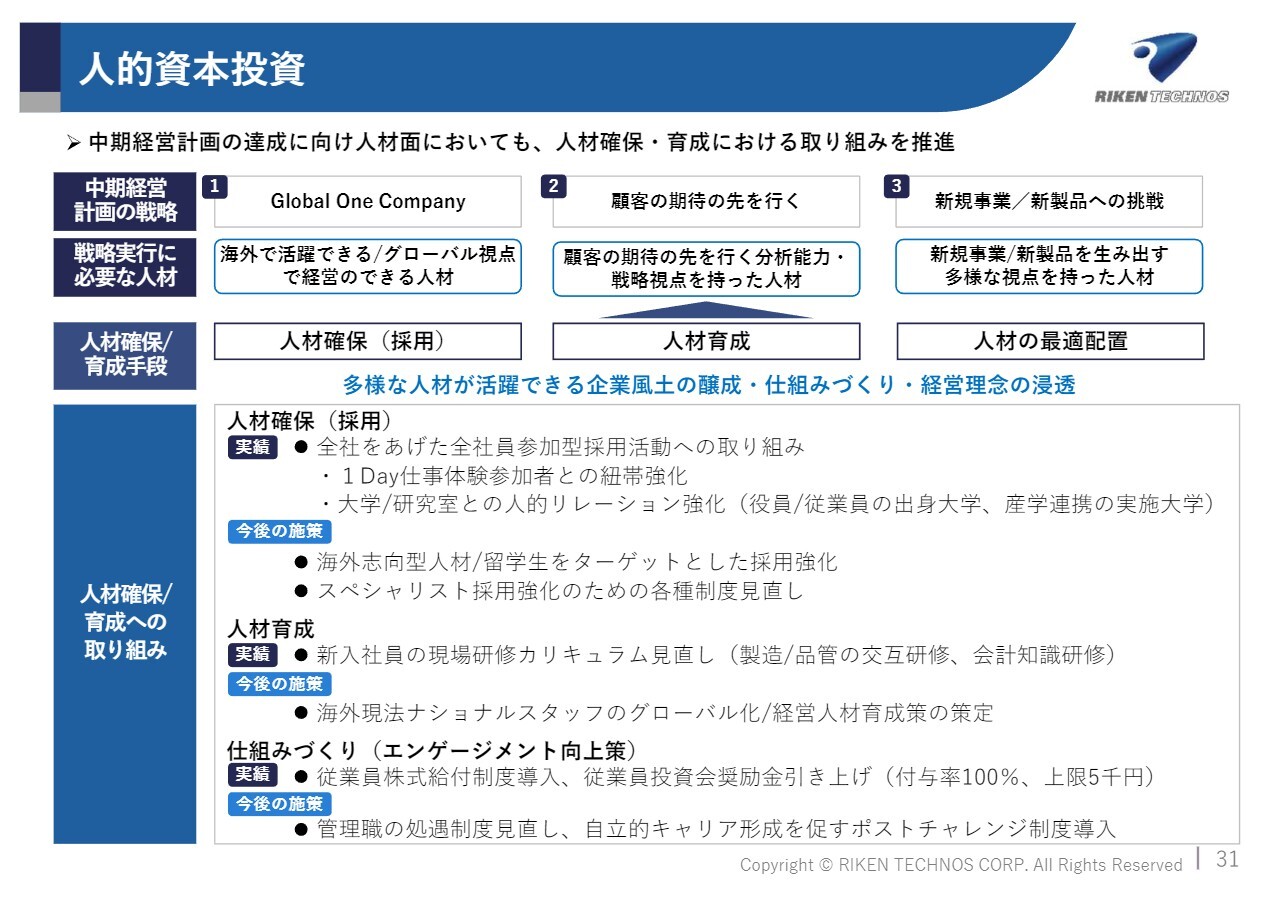 続きまして、人的資本投資についてご説明します。中期経営計画の戦略を確実に実行するため、人材の確保や育成に向けた取り組みを進め、積極的に投資を行っていきます。まず、人材の確保では、全社を挙げた全社員参加型の採用活動に取り組んでいます。