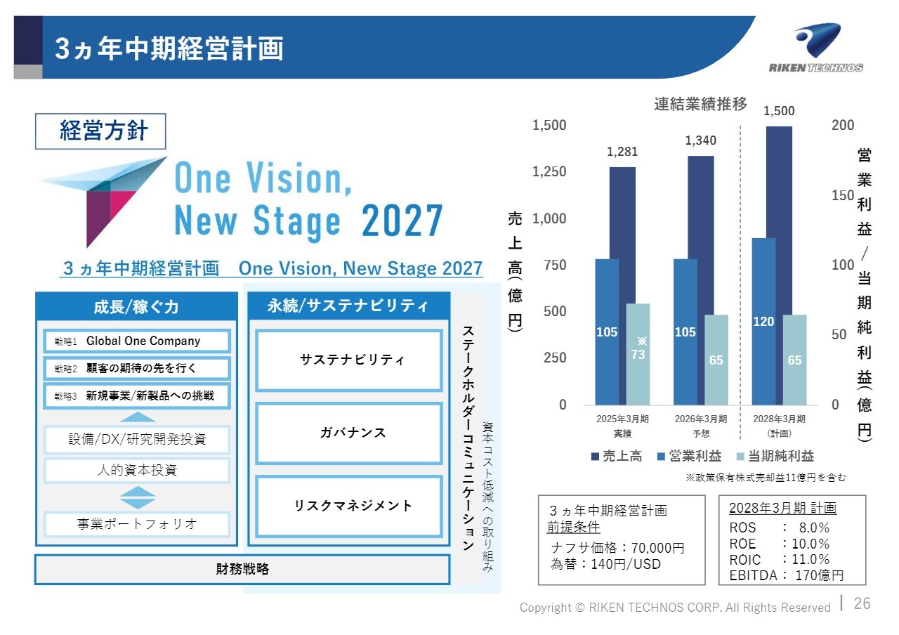 稼ぐ力の3つの戦略として、戦略の1つ目「Global One Company」、戦略の2つ目「顧客の期待の先を行く」、戦略の3つ目「新規事業/新製品への挑戦」を掲げています。加えて、企業を永続的に存続させるため、サステナビリティ、ガバナンス、リスクマネジメントにも取り組んでいきます。計数計画については、最終年である2028年3月期に売上高1,500億円、営業利益120億円、当期純利益65億円を目指しています。その他の計数計画はスライドをご覧ください。