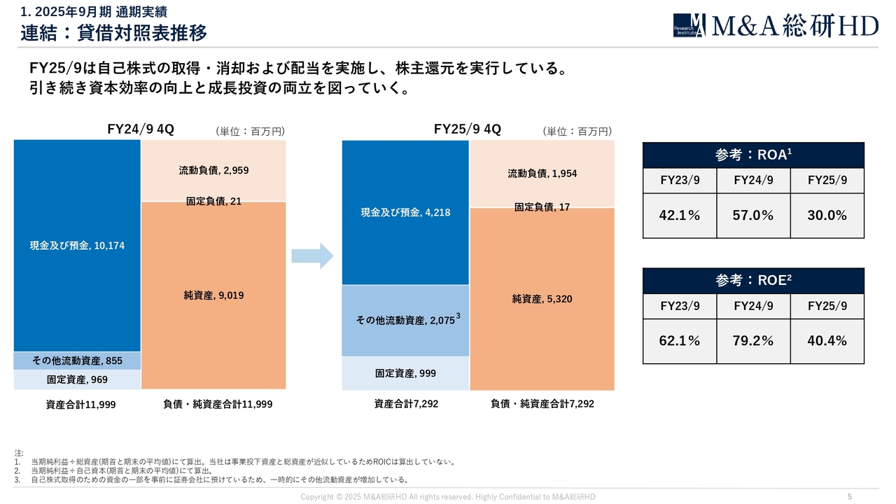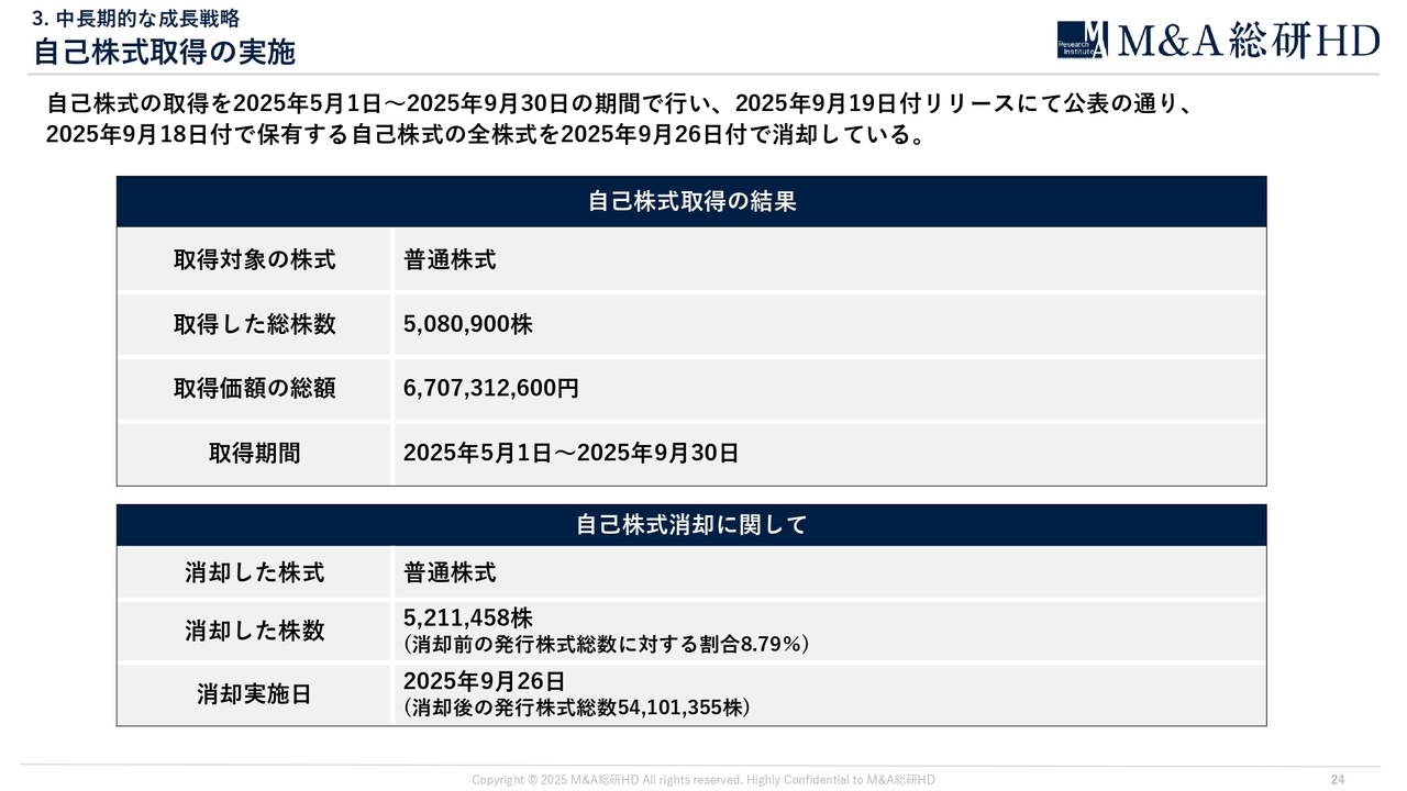 佐上:自己株式の取得についてご説明します。当社は2025年5月1日から2025年9月30日の期間において自己株式の取得を実施しました。また、2025年9月19日付リリースで公表のとおり、発行株式総量に対して8.79パーセントに相当する自己株式すべてを2025年9月26日付で償却しています。