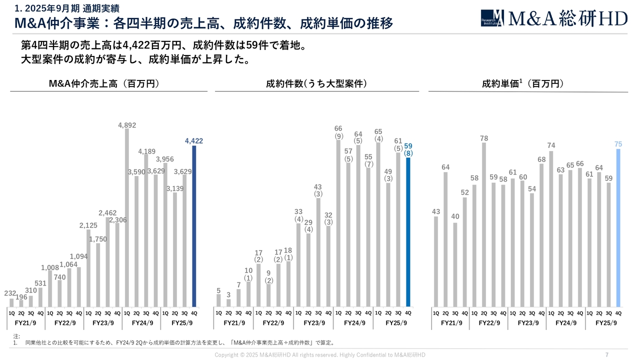 佐上:四半期ごとの売上高、成約件数、成約単価の推移です。第4四半期単体の売上高は、大型案件8件の成約によって平均単価が7,500万円となり、過去最高であった2024年9月期第1四半期に次ぐ水準となりました。
