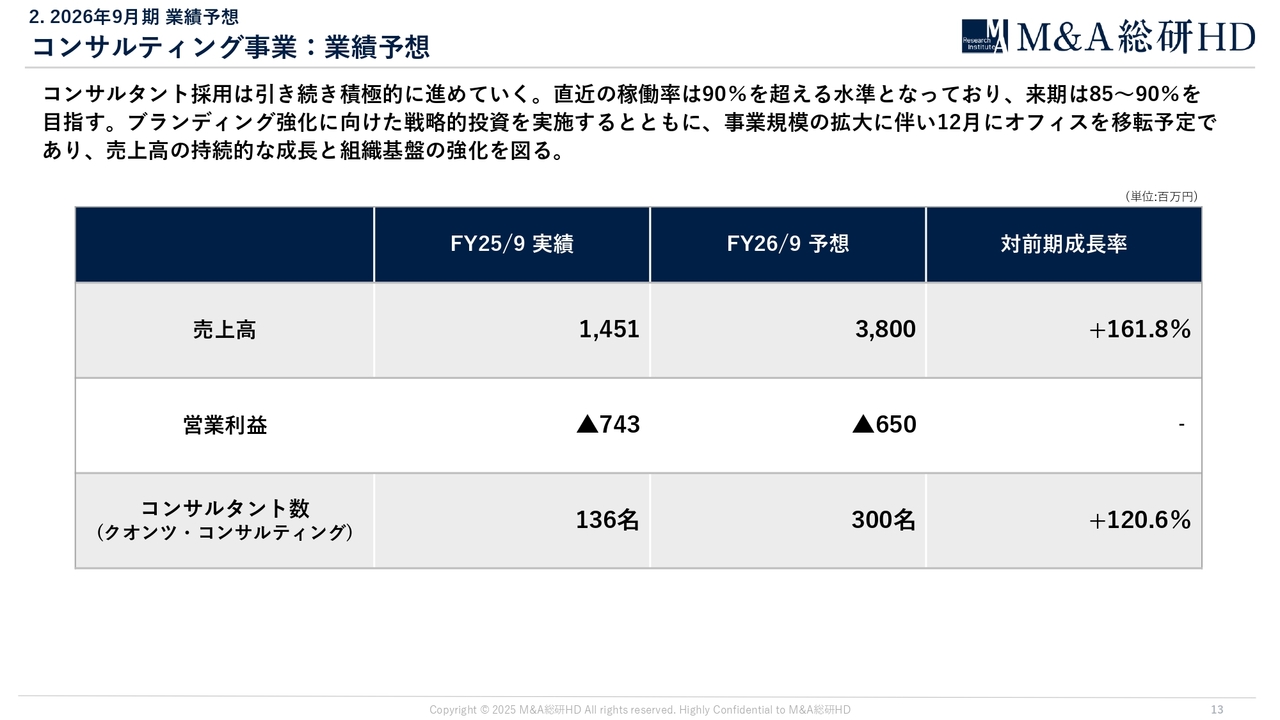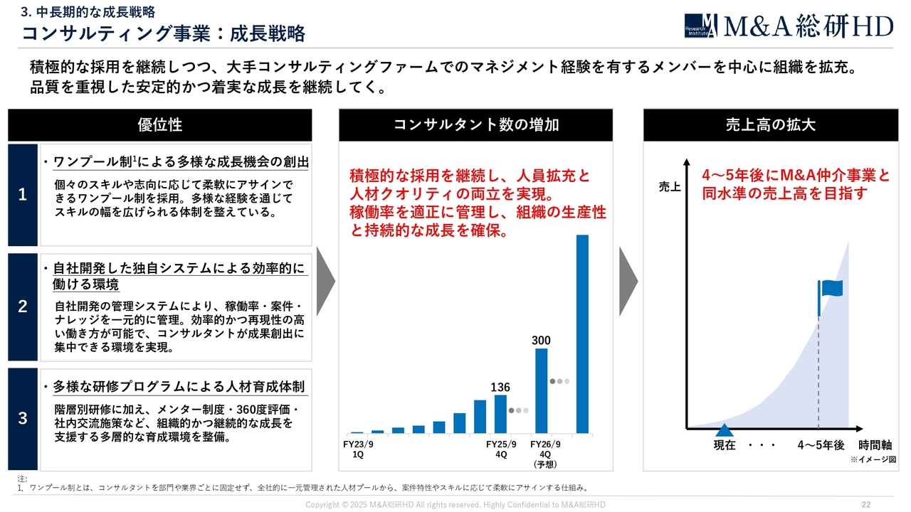 スライド中央のグラフはコンサルタント数の推移を示しています。2025年9月期末時点で136名、2026年9月期には300名程度の規模まで拡大を見込んでおり、人材拡充と人材クオリティの両立を図りながら、組織の生産性向上と持続的な成長を実現していきます。