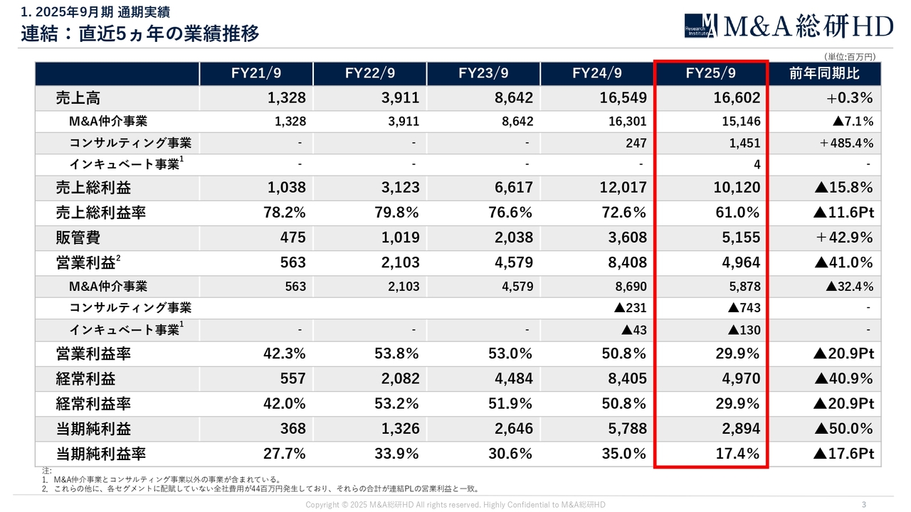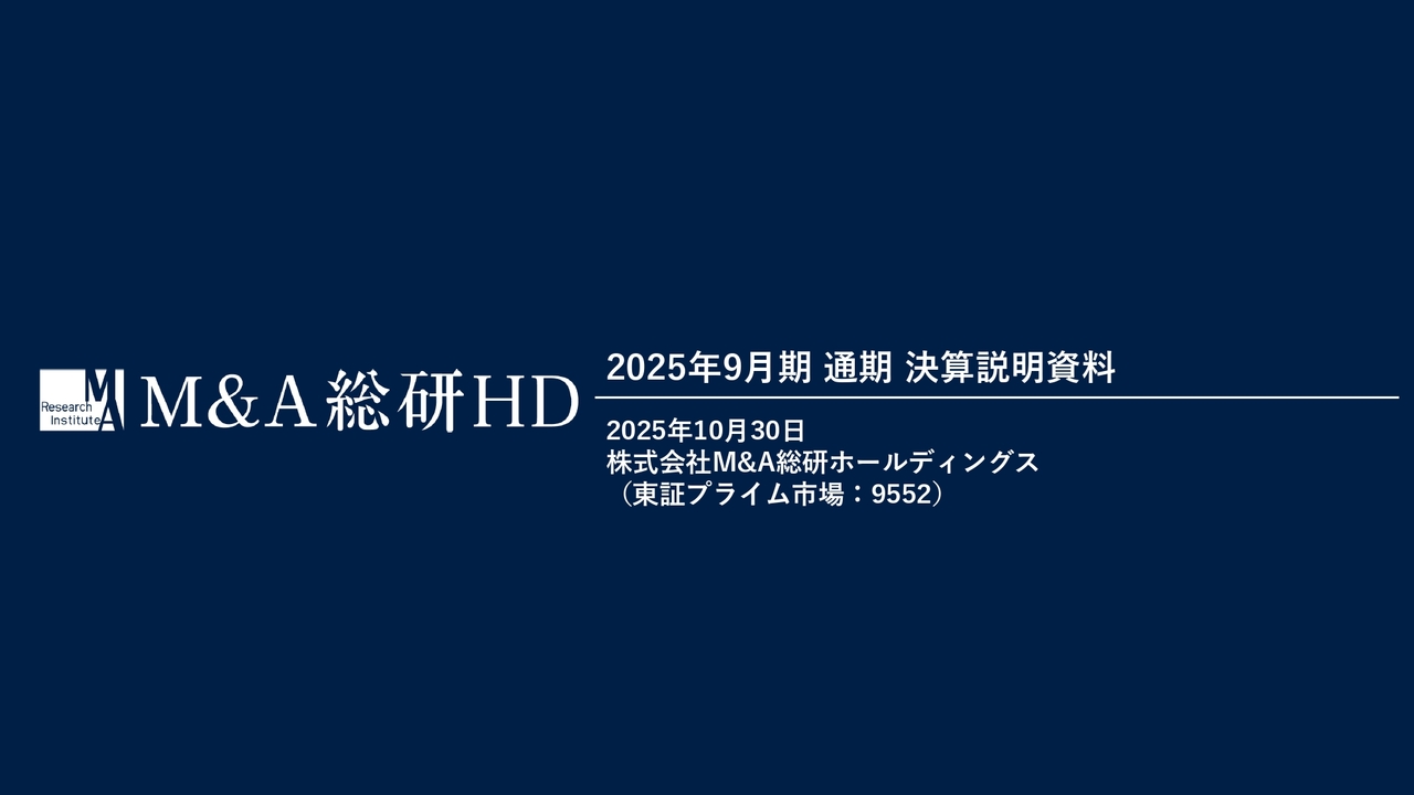 佐上峻作氏(以下、佐上):みなさま、本日はご参加いただきありがとうございます。M&A総研ホールディングス代表取締役社長の佐上です。本日は、先日公表した決算説明資料をベースに2025年9月期の通期実績、2026年9月期の業績予想、当社の中長期ビジョンについてご説明します。