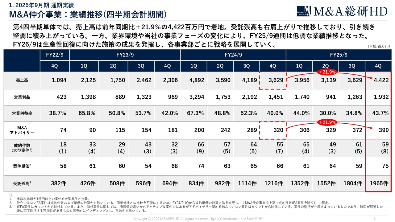 1. 2025年9月期 通期実績 M&A仲介事業:業績推移(四半期会計期間)
