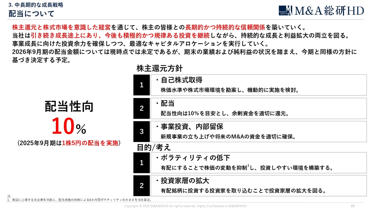 佐上:株主還元についてご説明します。2025年9月期の純利益に基づき、配当性向10パーセントを目安として、1株当たり5円の配当を実施する予定です。