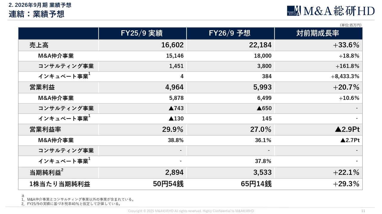 事業ごとに見ると、M&A仲介事業は売上高が180億円、営業利益が64億9,000万円、営業利益率が36.1パーセントです。コンサルティング事業は売上高が38億円、営業損失が6億5,000万円です。インキュベート事業は売上高が3億8,000万円、営業利益が1億4,000万円、営業利益率が37.8パーセントを見込んでいます。