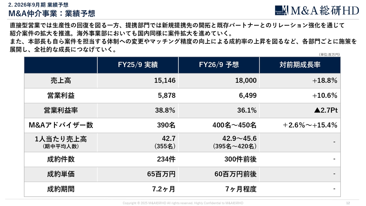 一方、M&A仲介事業については、M&Aアドバイザー1人当たりの生産性、収益性を一段と強化し、安定的かつ高収益な事業モデルを確立させていくフェーズと考えています。