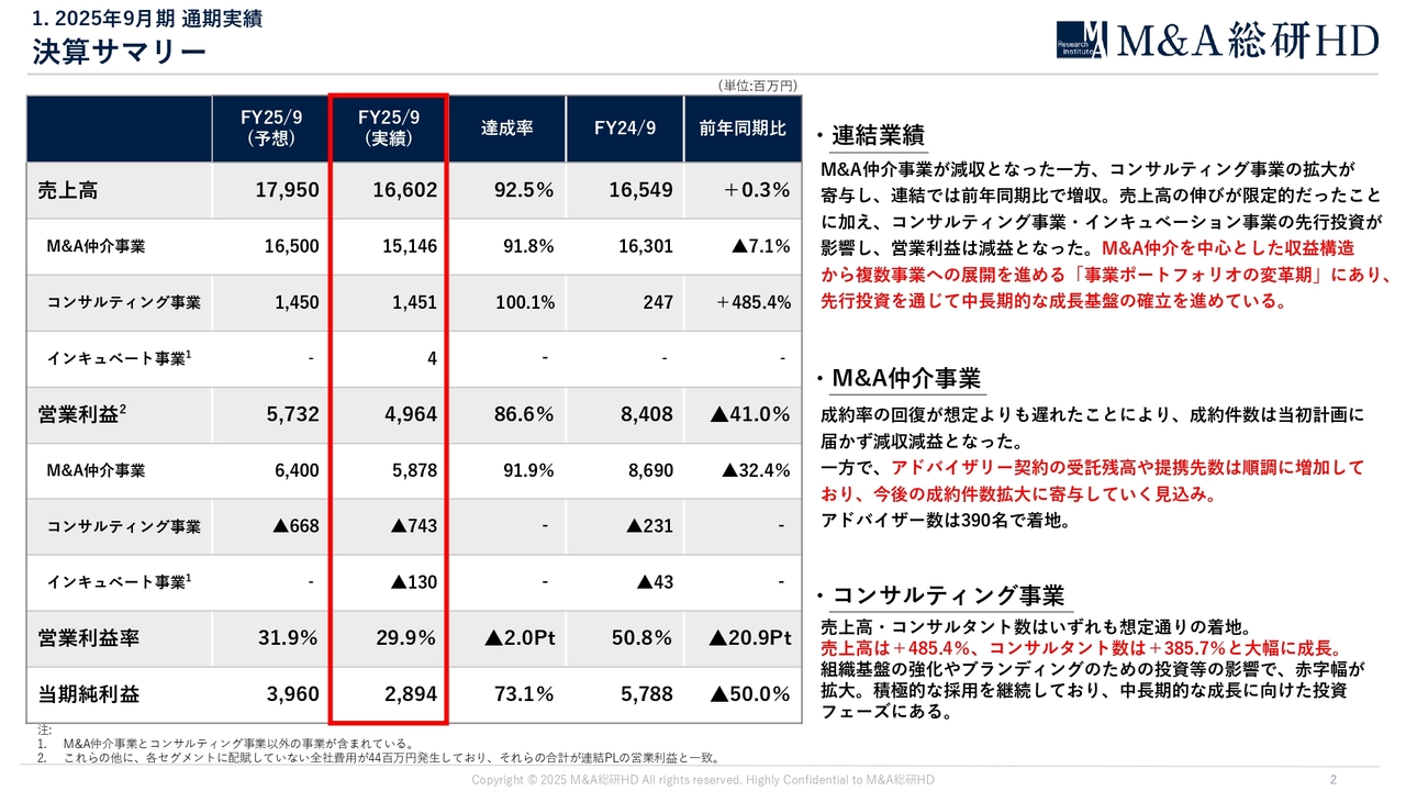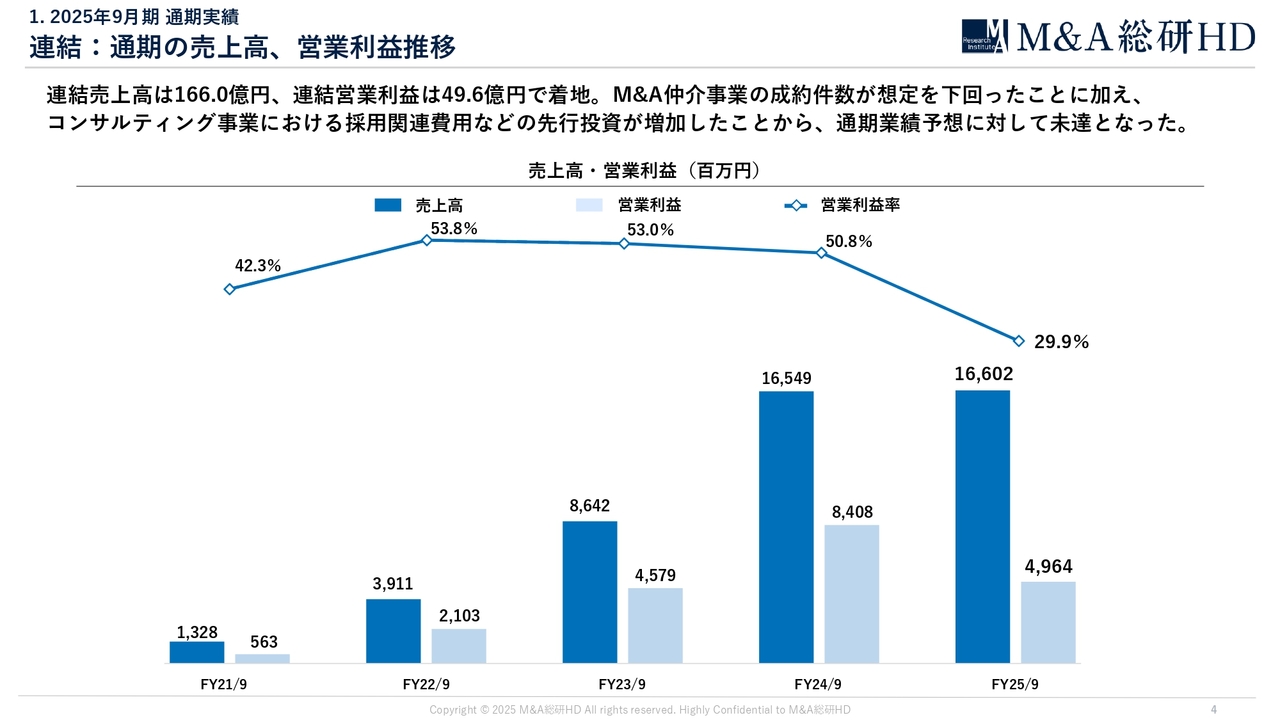 コンサルティング事業やオペレーティング・リース事業への先行投資を継続しつつ、M&A仲介事業の安定成長も両立させることで、次のステージに向けた基盤作りを進めています。そのような中で、2025年9月期は売上高が166億円、営業利益が49億6,000万円となりました。