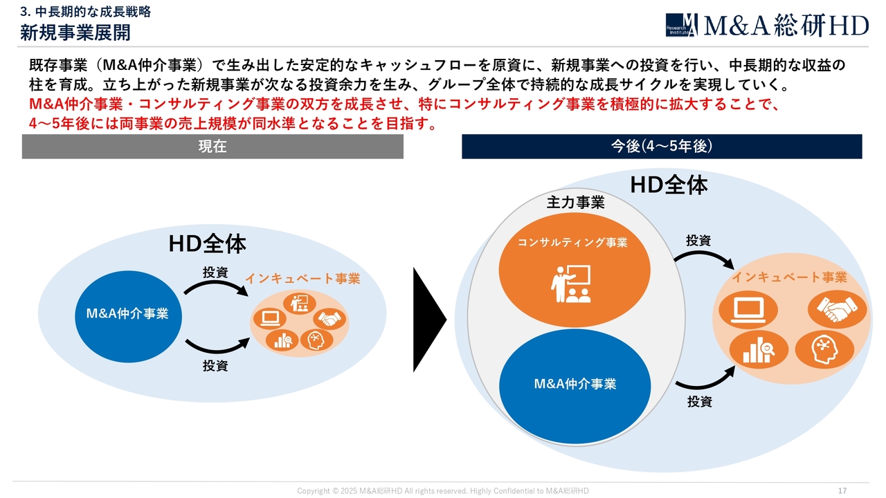 引き続き、人材投資と事業基盤の強化を着実に進めていき、4年後から5年後には、M&A仲介事業と同程度の売上規模へ成長させることを目指しています。
