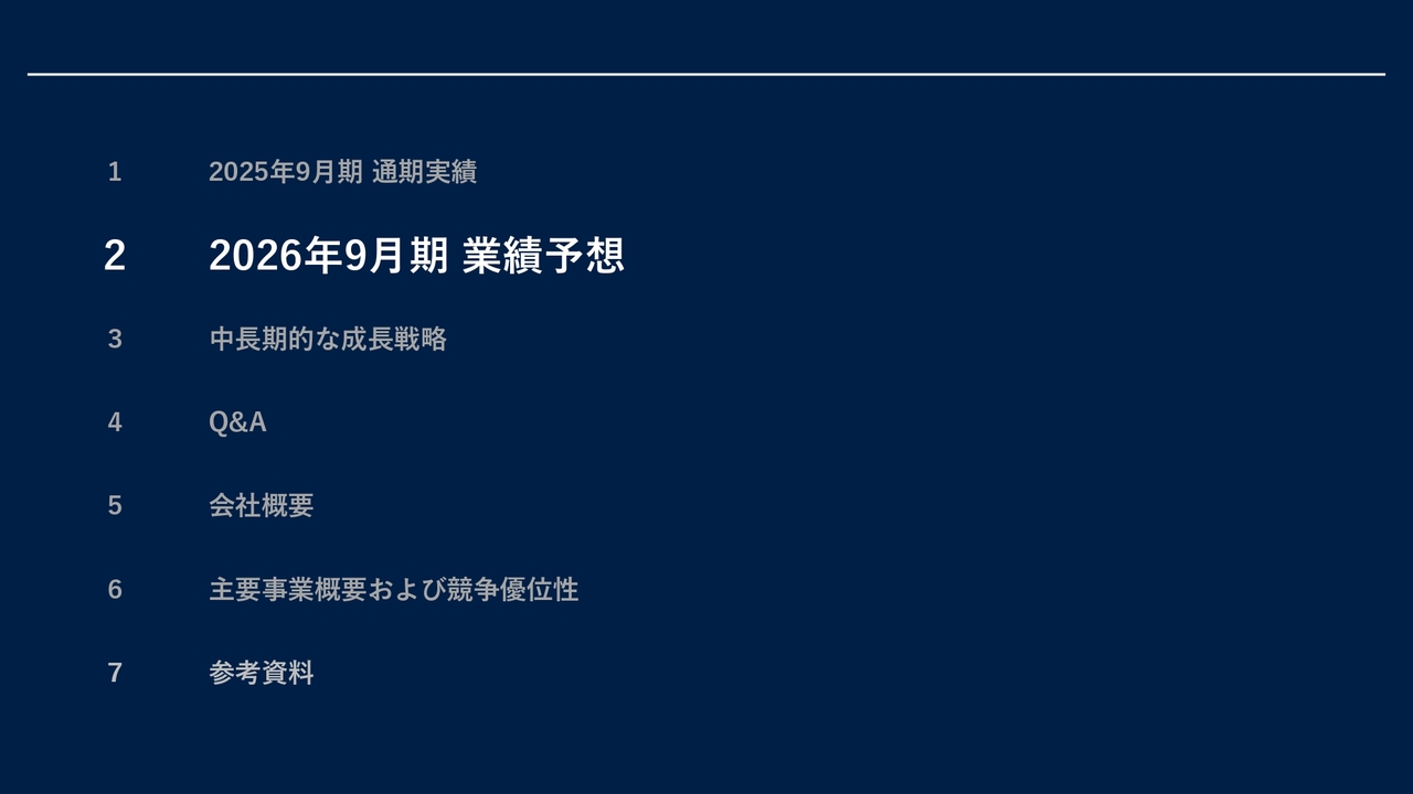 2025年9月期は業界環境の変化や当社の事業フェーズの転換もあり、全体としては低調な業績推移となりました。2026年9月期は生産性の回復に向けた施策の成果を反映させ、事業部ごとに戦略的な取り組みを進めていきます。