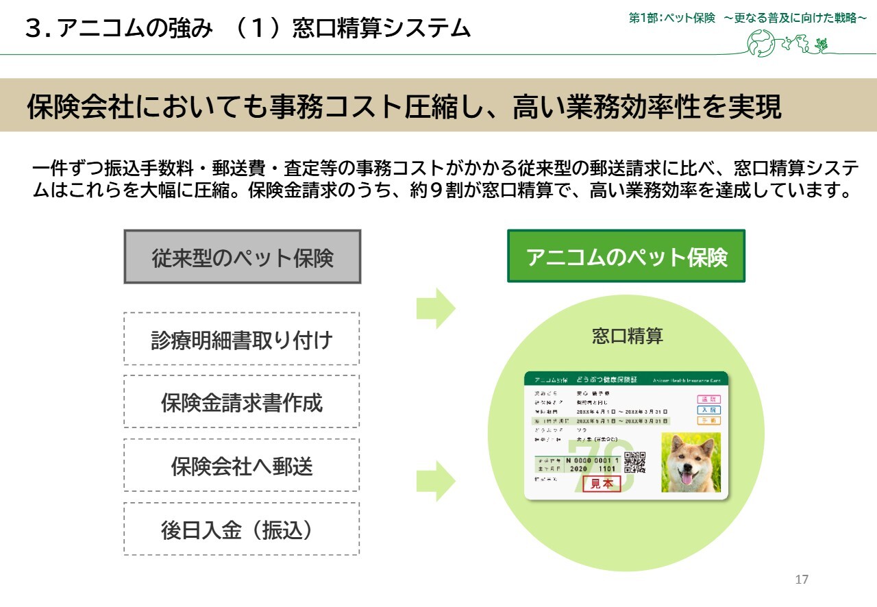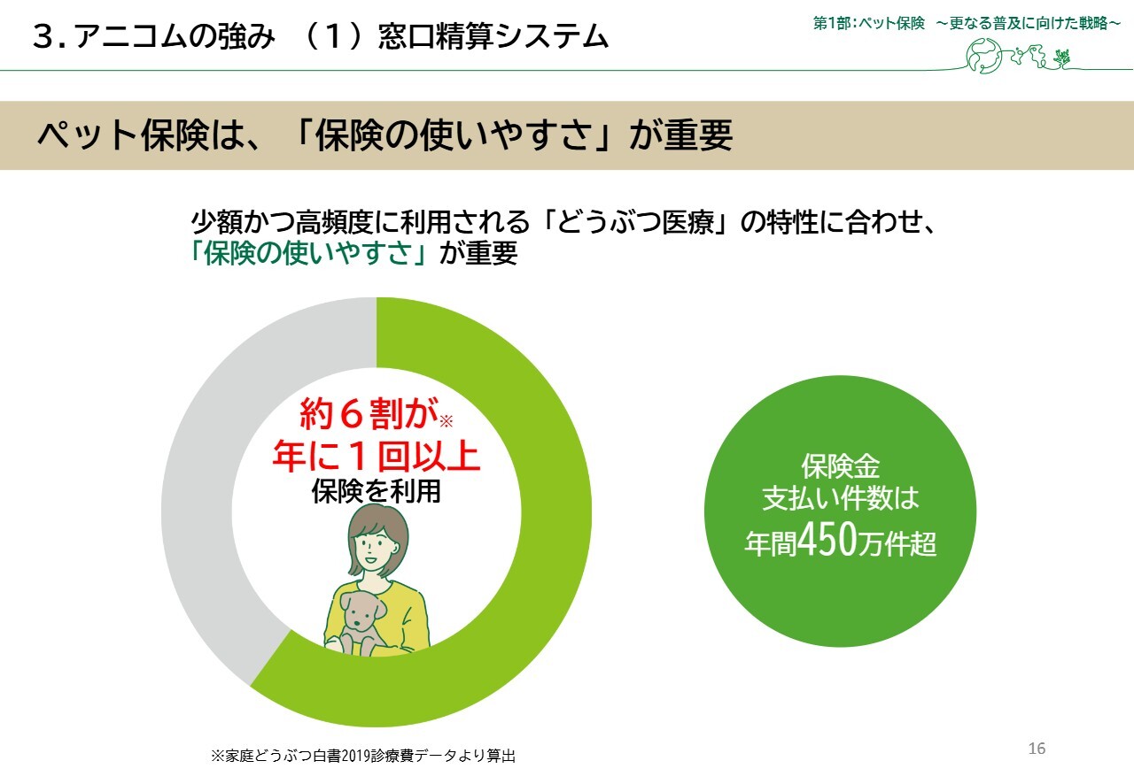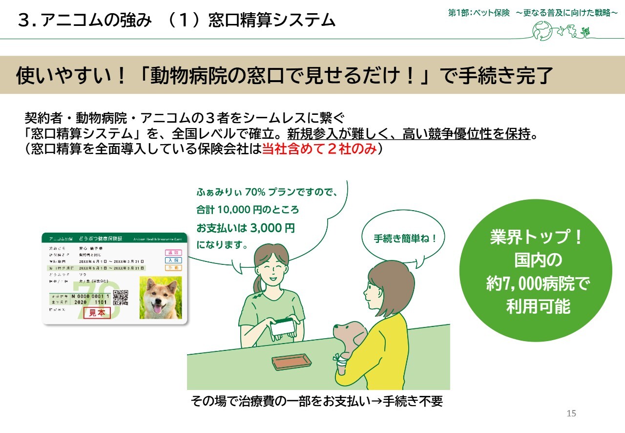国内のほとんどすべての動物病院である7,000病院以上と提携しており、窓口精算を利用することができます。窓口精算を全面導入している保険会社は、我々と2番手の会社の2社だけです。これも高い競争優位性の一因になっていると考えています。