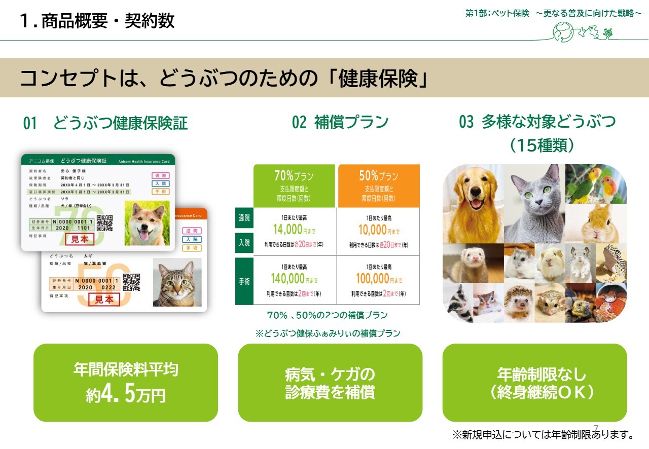 野田:ペット保険事業についてお話しします。はじめに、我々のペット保険の商品をご説明します。コンセプトは、動物のための健康保険です。人の健康保険と同じように、「どうぶつ健康保険証」という保険証を発行します。